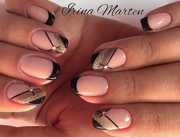 - Restrained and elegant look french with a black tip, light geometry, golden glitter and rhinestones on the index and ring finger. This nail design can be combined with an evening dress, and with the style of casual.