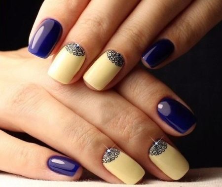 - Design in blue and yellow colors with lace moon decoration and rhinestones will suit middle-aged women. This design looks very respectable and elegant.
