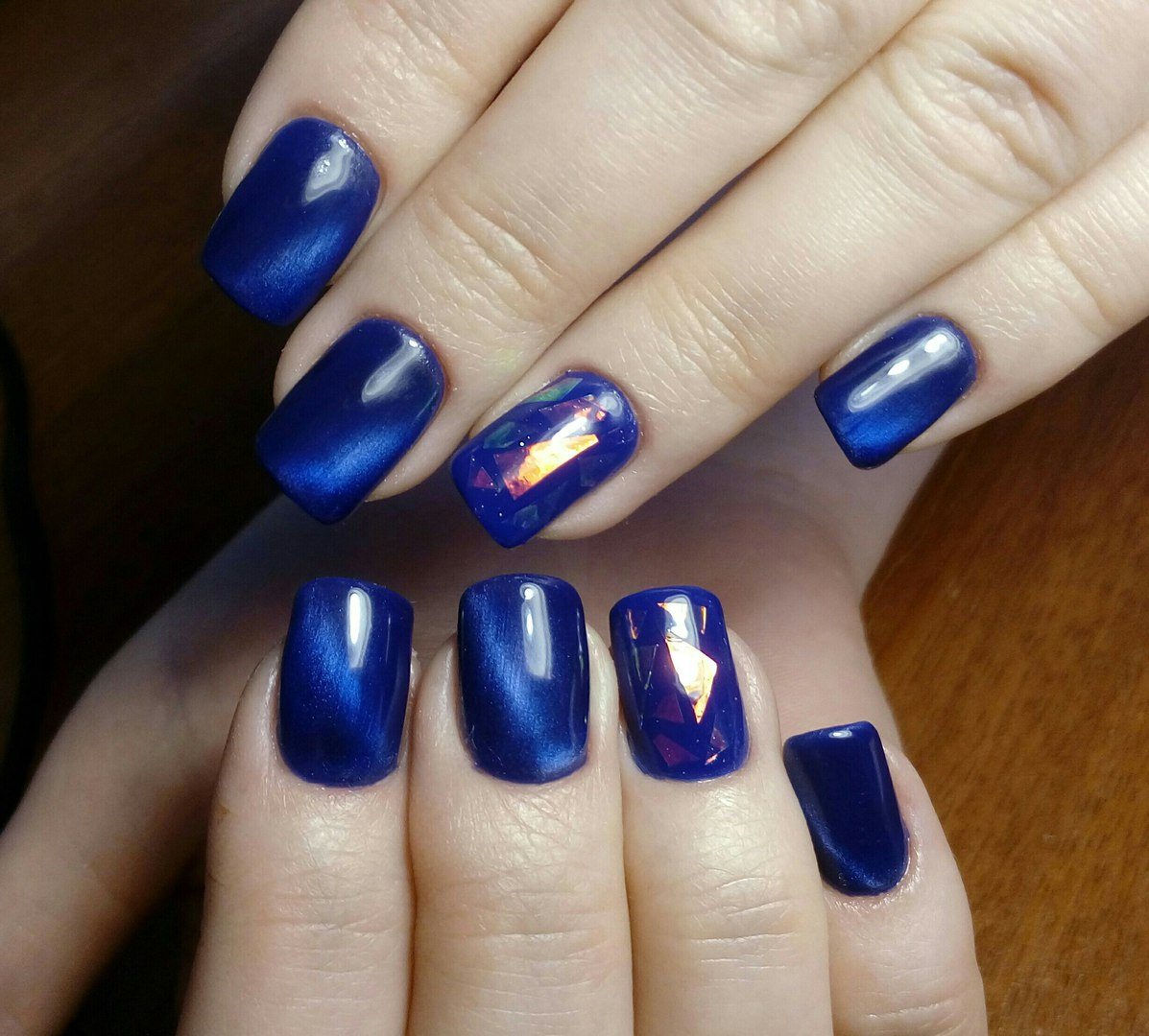 The first layer of gel polish is applied to the desired effect, either in the base tone or in the one reflected in the depth of the nail. At this stage, magnet processing is optional. It all depends on the desired result and is determined experimentally.