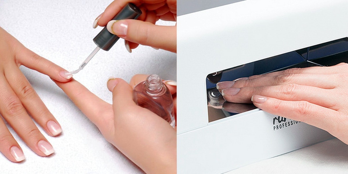First, the base is applied to protect the nail plate from damage. When processing do not forget about the end of the nail. Then the coating must be thoroughly dried under ultraviolet light.