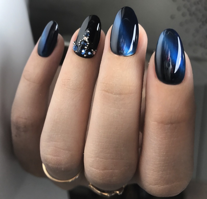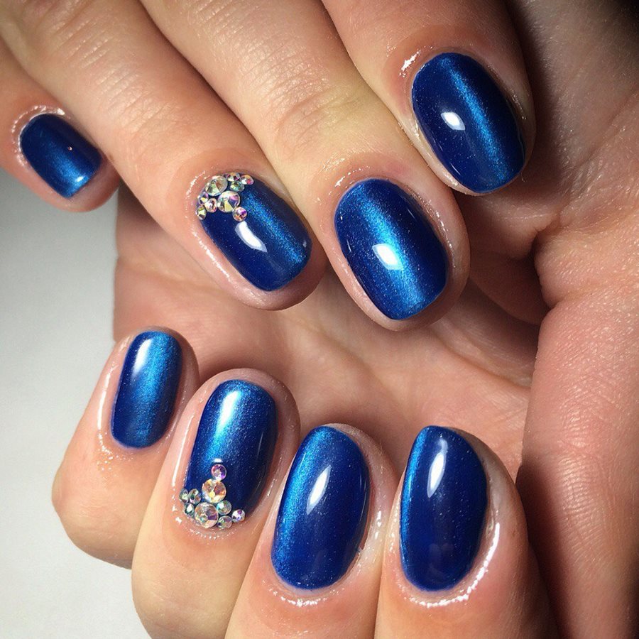 Glare on a background of blue or blue hue can be placed along, across, obliquely or along the edge of the nail plate.Further, the composition can be decorated with rhinestones or patterns.