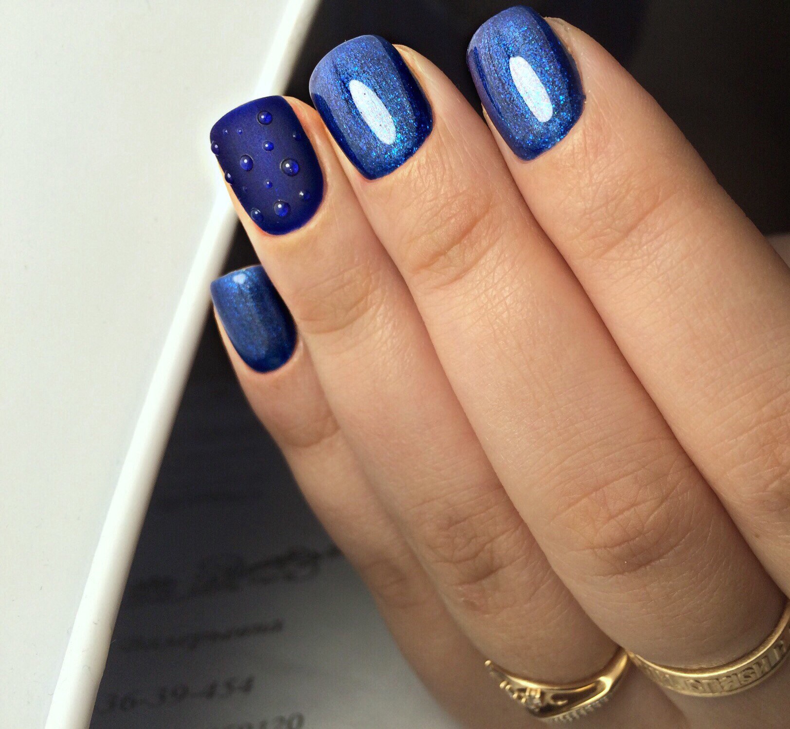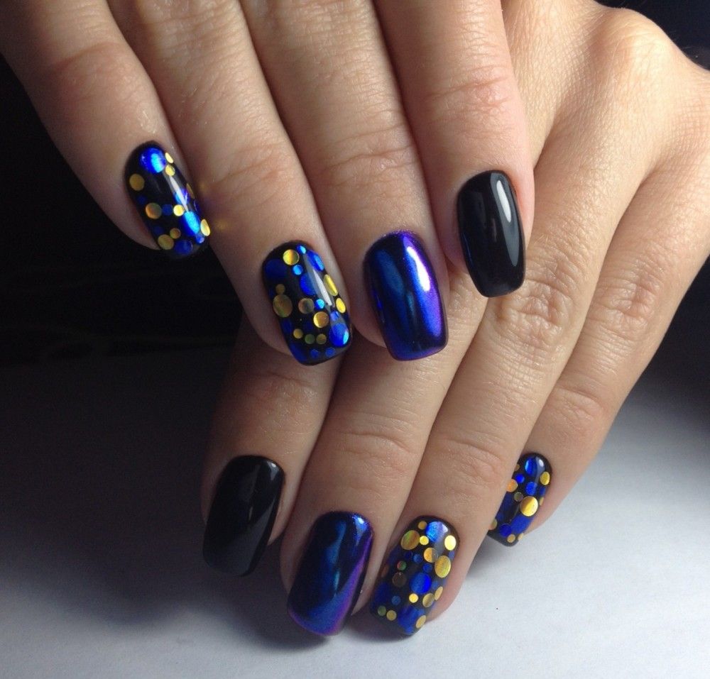 Any of the blue tones is perfectly combined with the whole cold range., with green and shades of yellow. In addition, silver and golden decor, various rhinestones and foil stand out against its background.