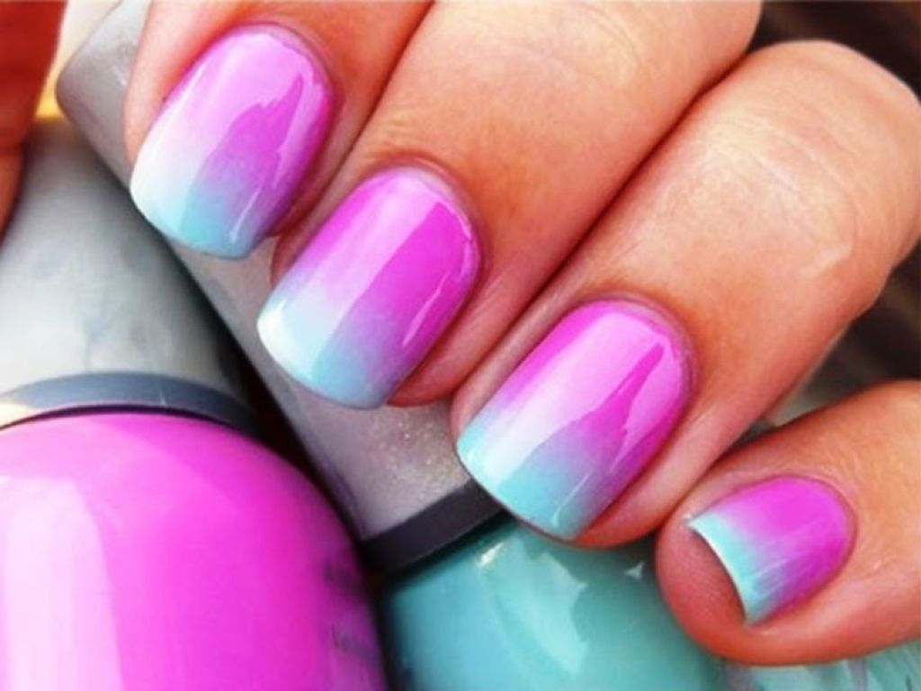 - Ombre. Characterized by the use of two contrasting shades, which are separated by a thin line. It is not necessary to make clear transitions between colors. This design is created using gradient technology. An interesting option is considered and the separation of bright colors in two stripes, they need to be drawn at a sharp angle. For an evening look, it is recommended to use a combined jacket: on one or two fingers, you should draw a classic “smile”, and the edges of the remaining nails should be highlighted with curved colored lines arranged randomly.