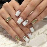 - White For several decades in fashion, tones can be different - from milky to pearl. Such a coating can be both matte and glossy. Marigold, decorated with this varnish, suitable for young girls, give them lightness and airiness. To make the coating more stylish, it makes sense to experiment with the overflow of several shades and apply decorations with rhinestones.