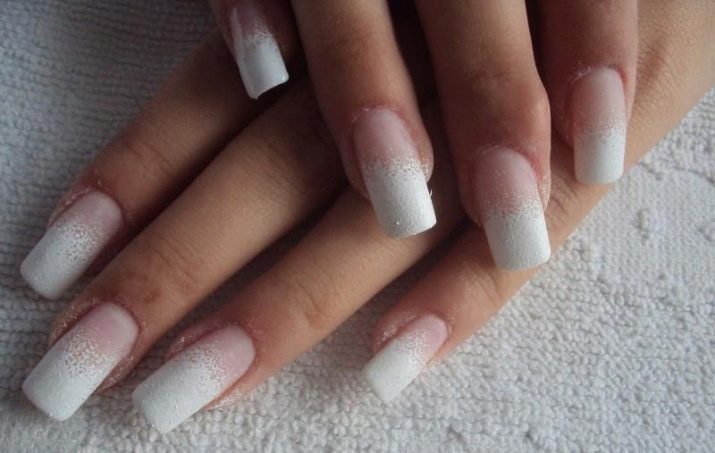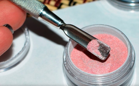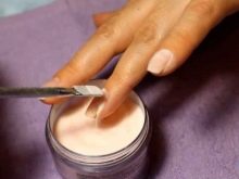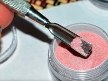 Acrylic powder with a transparent matte effect is very simple to use, because it can be used without problems in the home environment. This coating is also called velvet sand. It is economical and relatively inexpensive. Acrylic powder is used exclusively for gel manicure, applied to the not dried top. In this form, the nails are placed in the lamp, dried, then the remains of powder are removed. The result is chic.