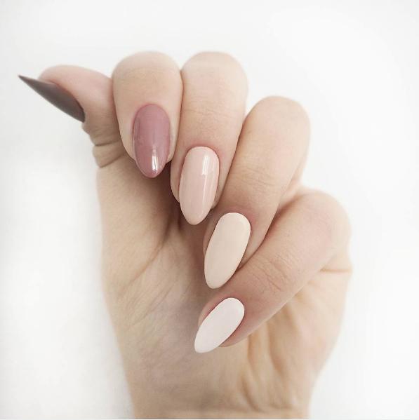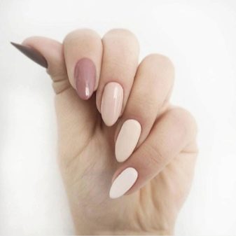 - Monochrome options. If bright combinations are not for you, but you still want to diversify the manicure, then you can consider a monochrome scale. Shades will differ in their saturation and brightness, while remaining within the same range. For example, it can be blue and blue or beige and brown. How exactly to combine them is up to you. You can fit several tones on one finger or provide your own color for each nail.