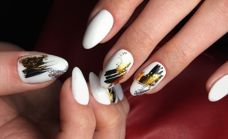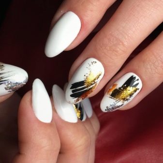 - Chaotic strokes. First you need to select the main background color. It can be both light and dark tones. The difference will be in the end result. In the first case, the manicure will look more gentle and feminine, in the second, it will not be devoid of brightness and originality. The master simply covers the nails in one tone, and then in a chaotic order applies large strokes so that the stripes are visible. To achieve the greatest effect, you can use several shades at once for the strokes themselves.
