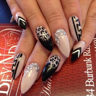 - Animal prints. It is on the almond shape that such bright accents will look as modest as possible. Do not think that in this category are only well-known leopard spots and tiger stripes. It may well be imitation of the feathers of paradise birds.