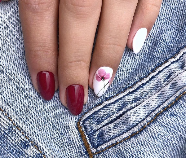 - Flowers Floral motifs are more suitable for summer and spring. If you want to decorate your nail with a juicy rose in winter, nobody will forbid you to do this. It will be interesting to look and so-called snow or frosty flowers. A small flower on the ring finger will remind everyone (including at work) about the romance of your nature, because a woman should always remain a woman, even if she is a highly qualified and respected specialist.