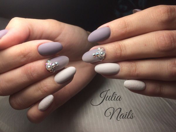 Professional lacquers, which give a suede effect, can imitate velor or even rubber, are especially popular. They look especially impressive in black, gray and dark blue. Matte shade allows you to visually narrow the nail plate, so it is suitable for those who have it very wide. You can use a special matting agent that is easy to use and does not require special knowledge and skills. You can easily make such a manicure at home by yourself, if you simply hold the glossy lacquer after applying over hot steam.