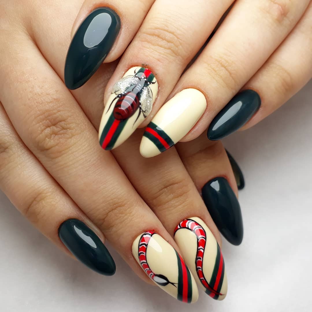 Speaking of color, it is impossible not to mention the dark color range, because the dark contrasts make light pigments more expressive and bright. In addition, often dark colors allow you to combine a manicure with accessories of female attire.For example, even if the color of the main background is not akin to wearing clothes, then due to the black or white pattern and the same tone of the bag, the manicure will be more organically entered into the bow.