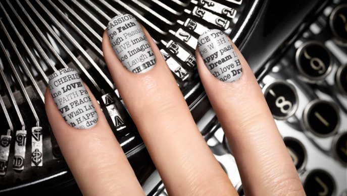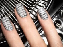 If the foil or caviar design does not attract, then a newspaper manicure with special stencils will look very unusual. It is usually performed in black and white. Each nail is a separate work of art. The first is applied to the base colorless layer, quickly put a piece of newspaper in alcohol and glued immediately to the nail. Then the paper is removed, and the print remains.