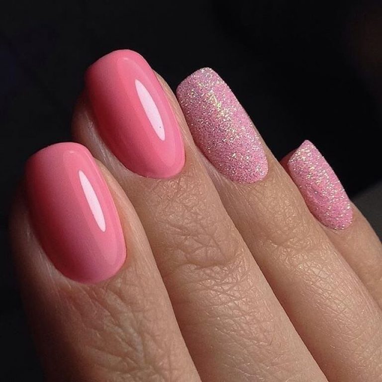 Matte finish with glitter looks intriguing and elegant. This is a very popular trend, it is allowed to use various light and calm shades. In addition, you can highlight the details and add a brilliant finish.