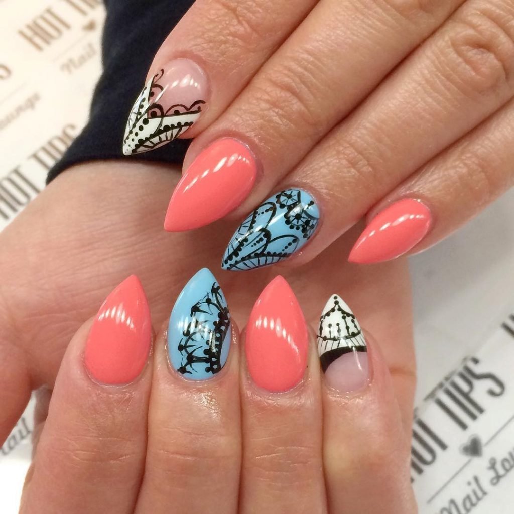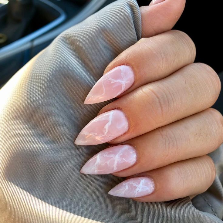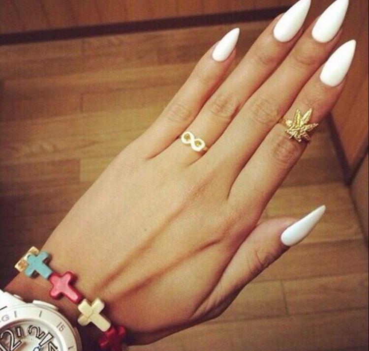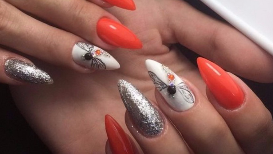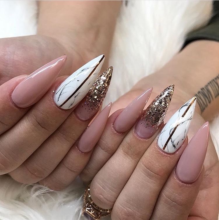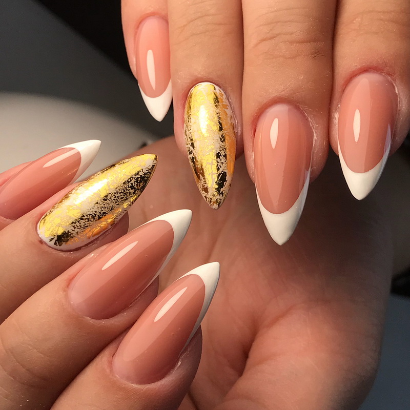 - Pointed fingers make it possible to embody the most creative nail designs. Here you can dream, use different colors, textures, decorative elements.