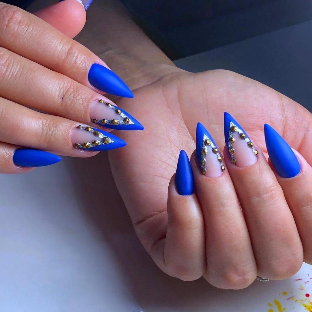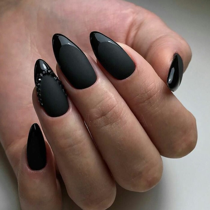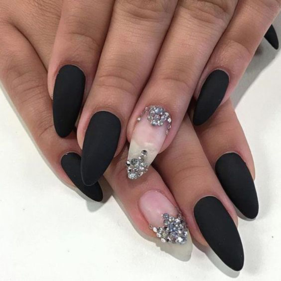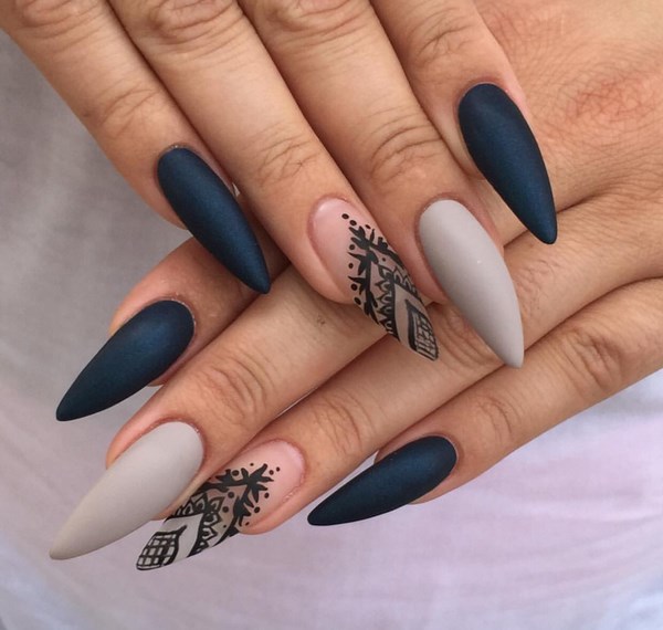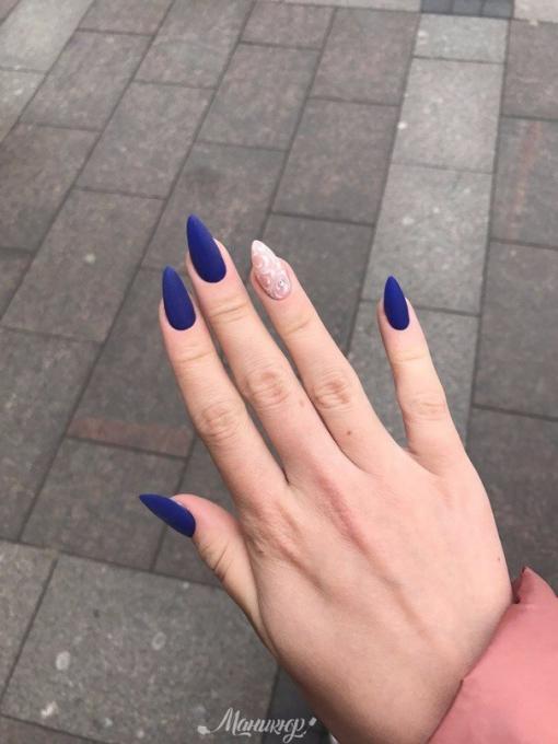 You can create attractive sharp nails with a matte finish. That it can give color saturation, emphasize the image. It is allowed to use a solid color or an interesting design.