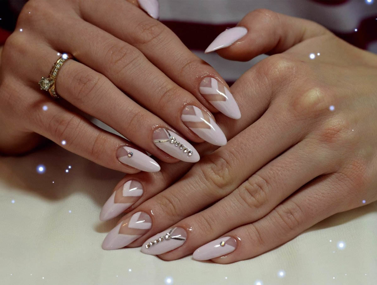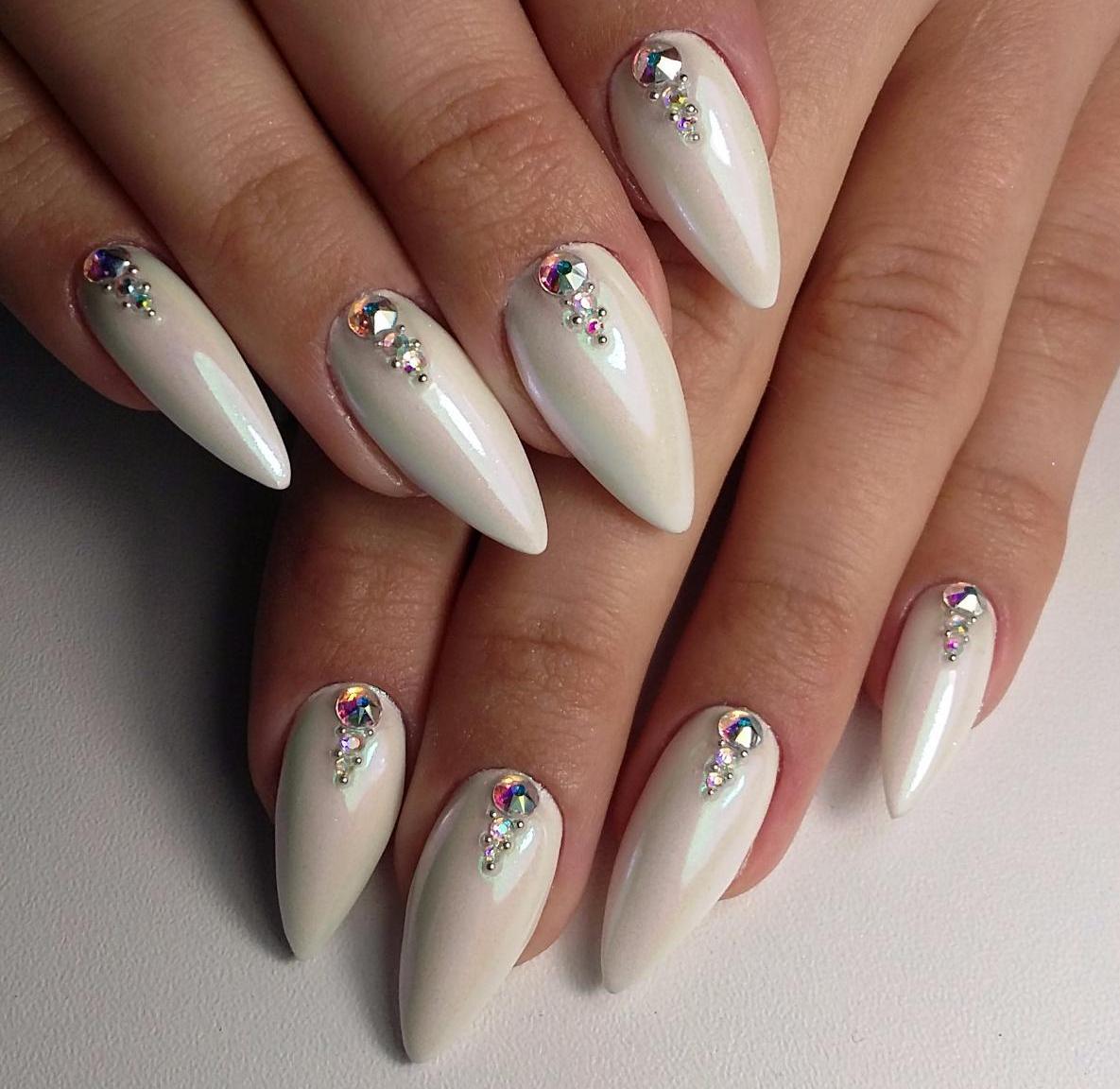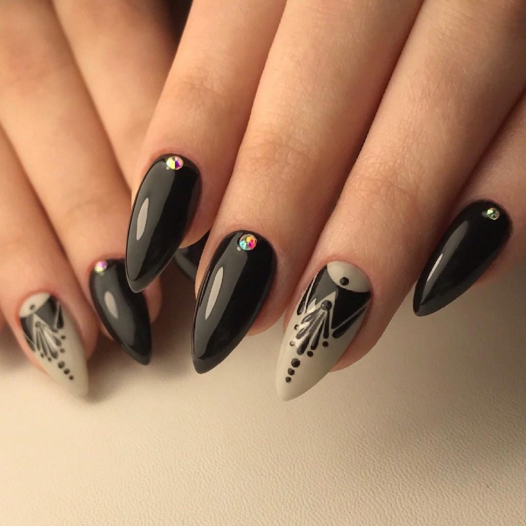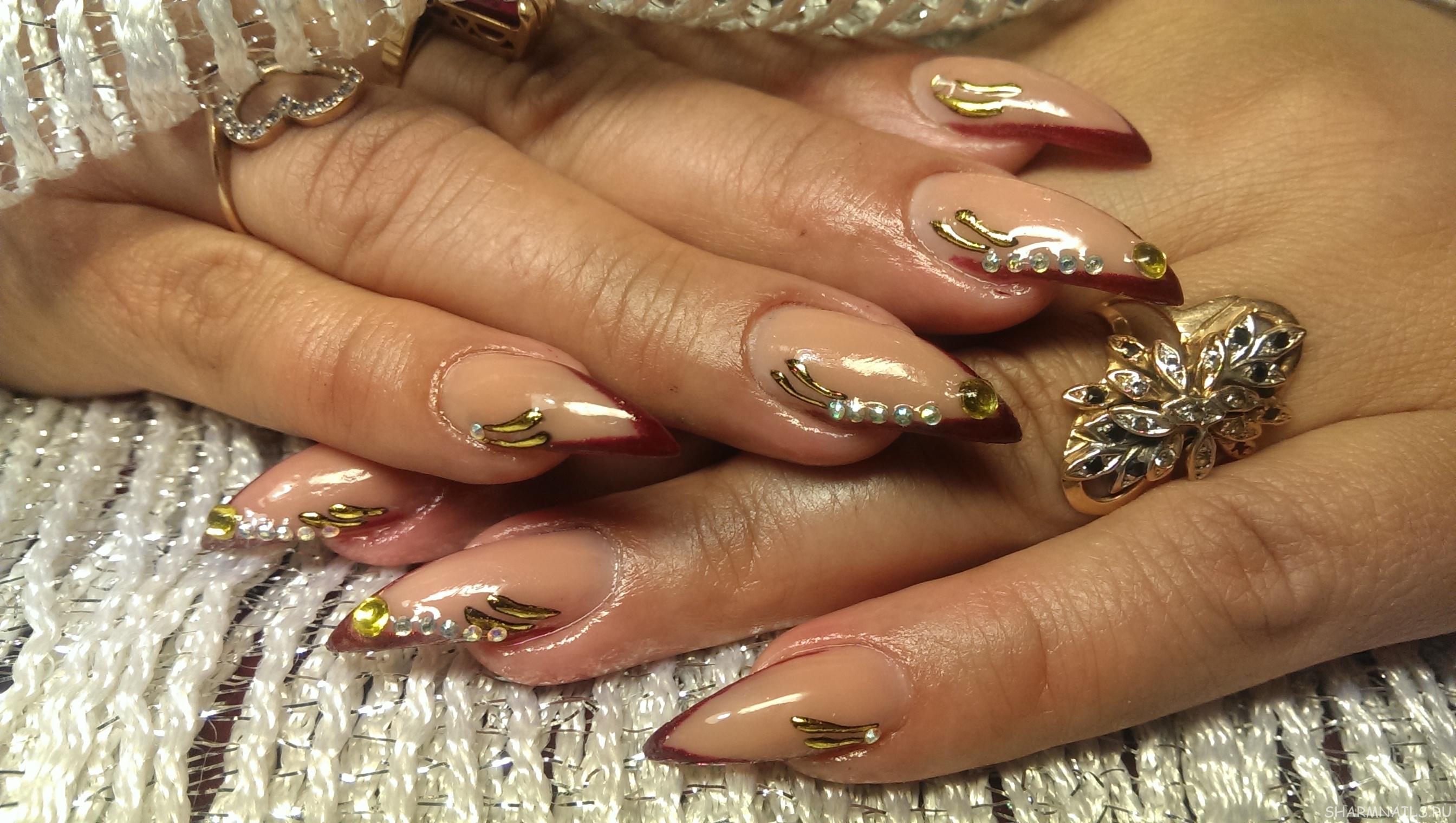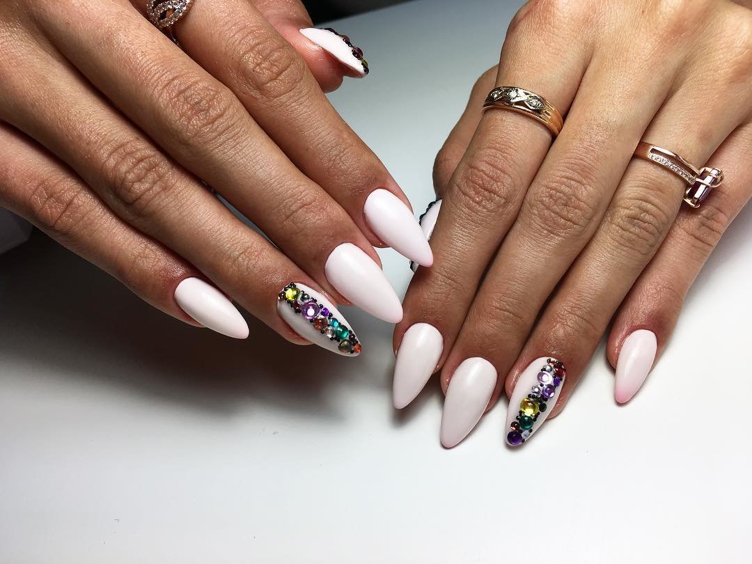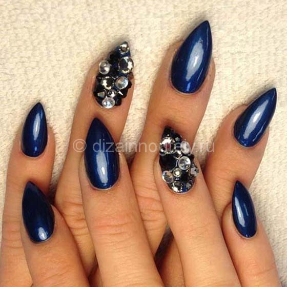 If you want to use rhinestones, then sharp nails should be decorated only on the base. So nail art will look stylish and attractive. Actually it will look like a pattern on the entire nail plate, and on a separate part of it. You can use various improvised tools to translate the ideal drawings: toothpicks, needles, dotsy.