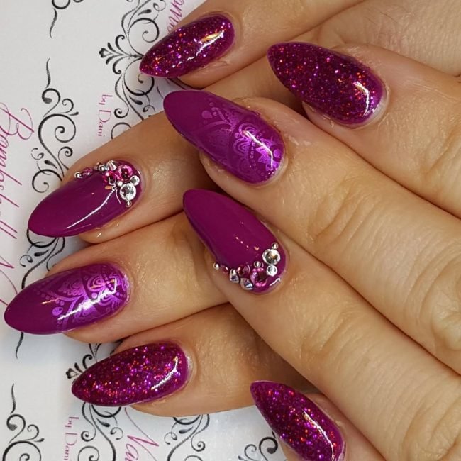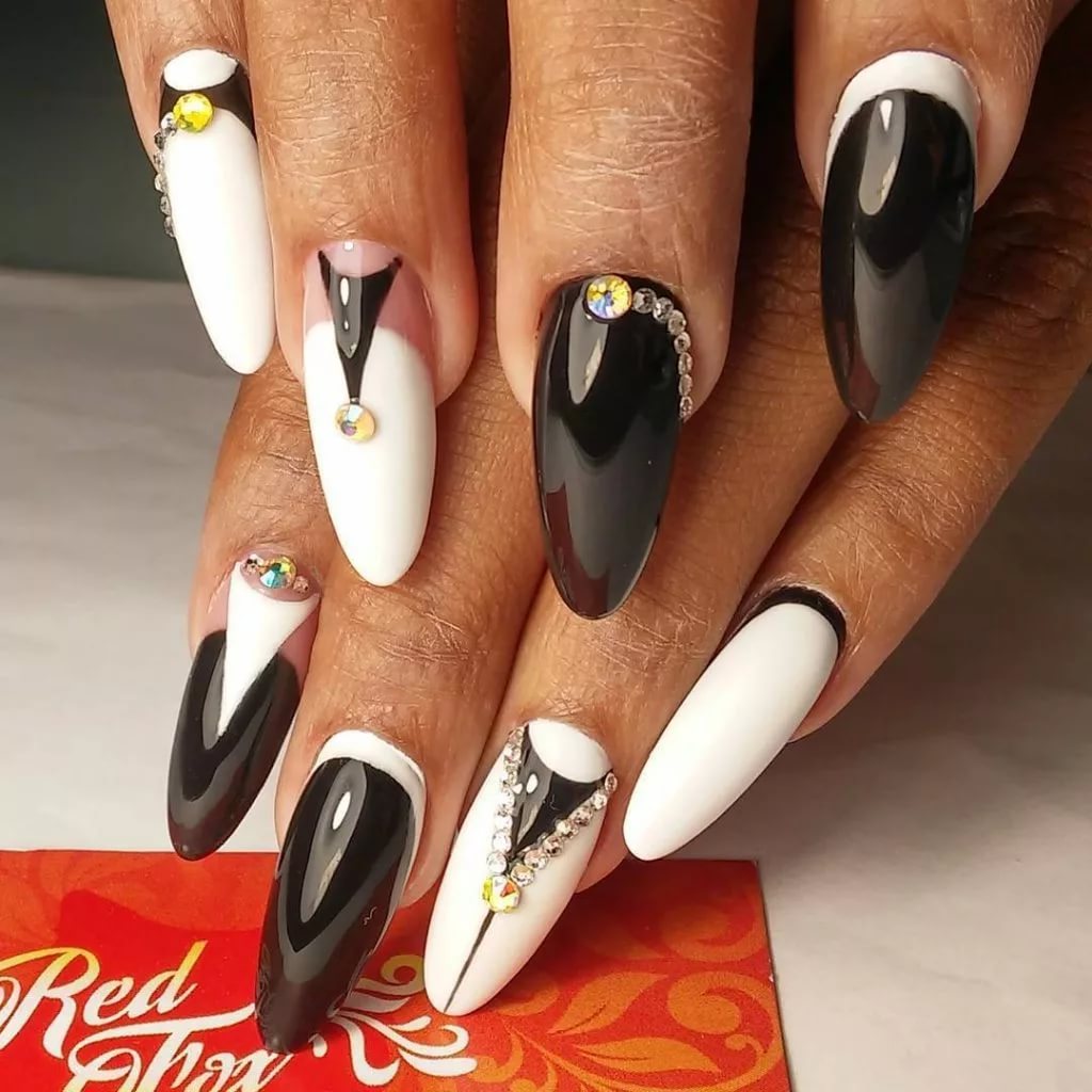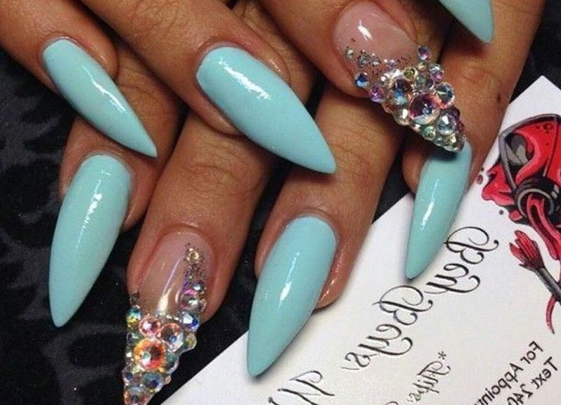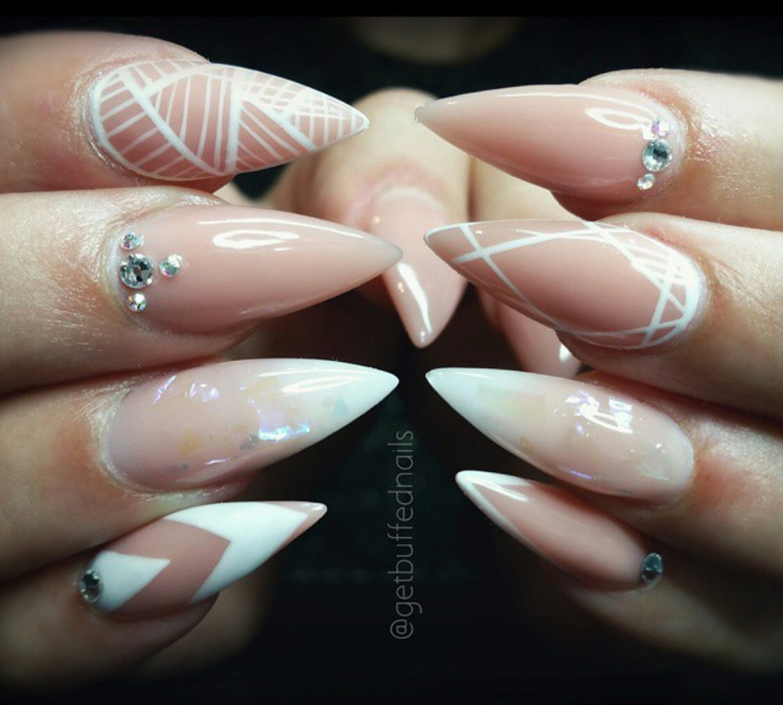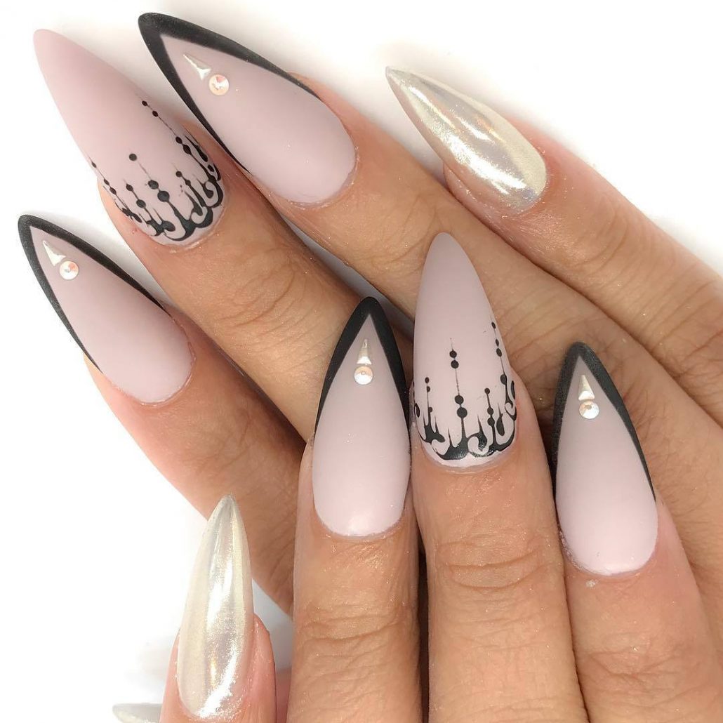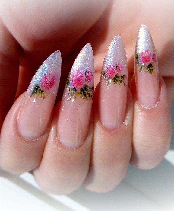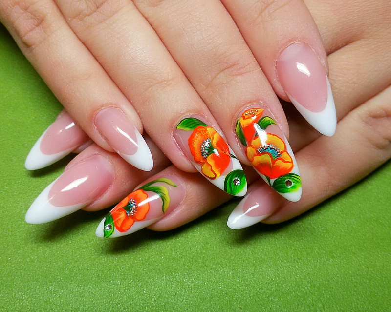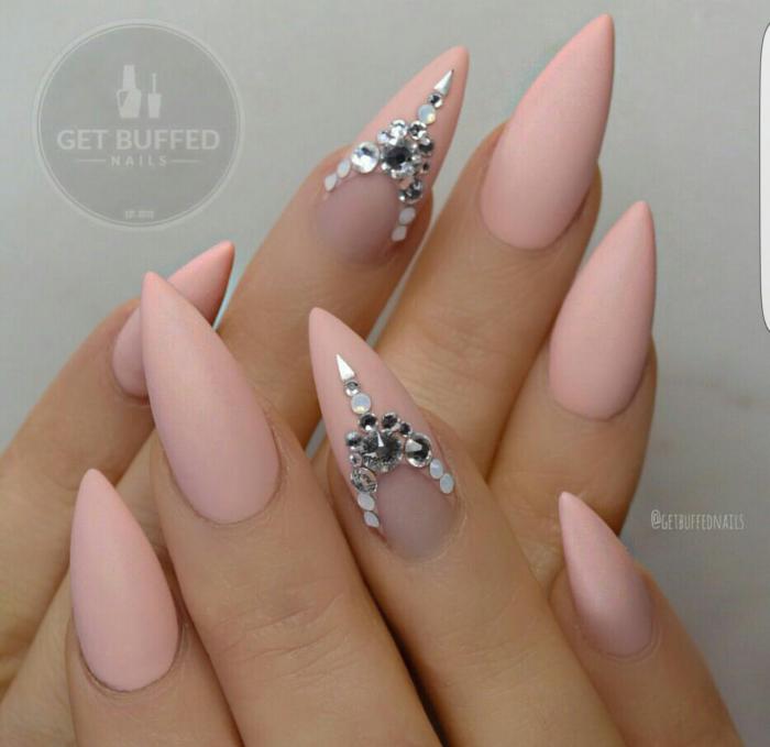 If you want to use rhinestones, then sharp nails should be decorated only on the base. So nail art will look stylish and attractive. Actually it will look like a pattern on the entire nail plate, and on a separate part of it. You can use various improvised tools to translate the ideal drawings: toothpicks, needles, dotsy.