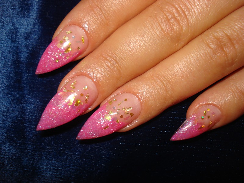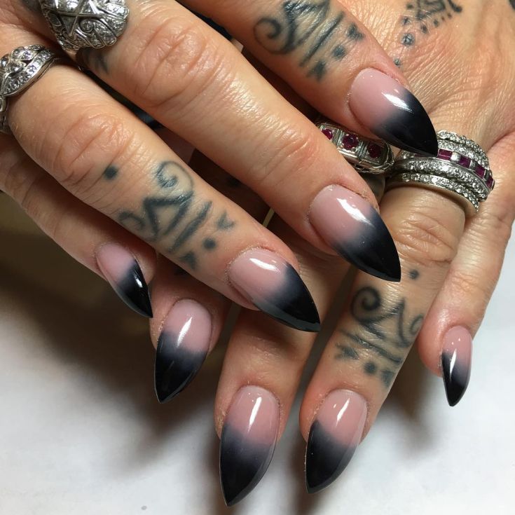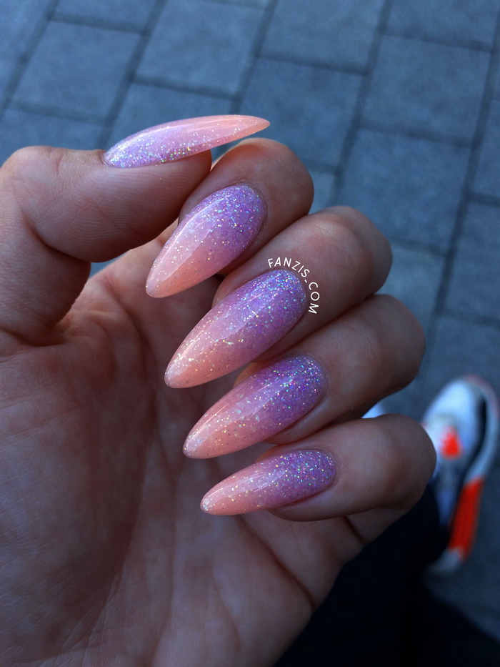 On the sharp form of nails, it is quite realistic to create an interesting horizontal gradient with various shades that will smoothly replace each other.
