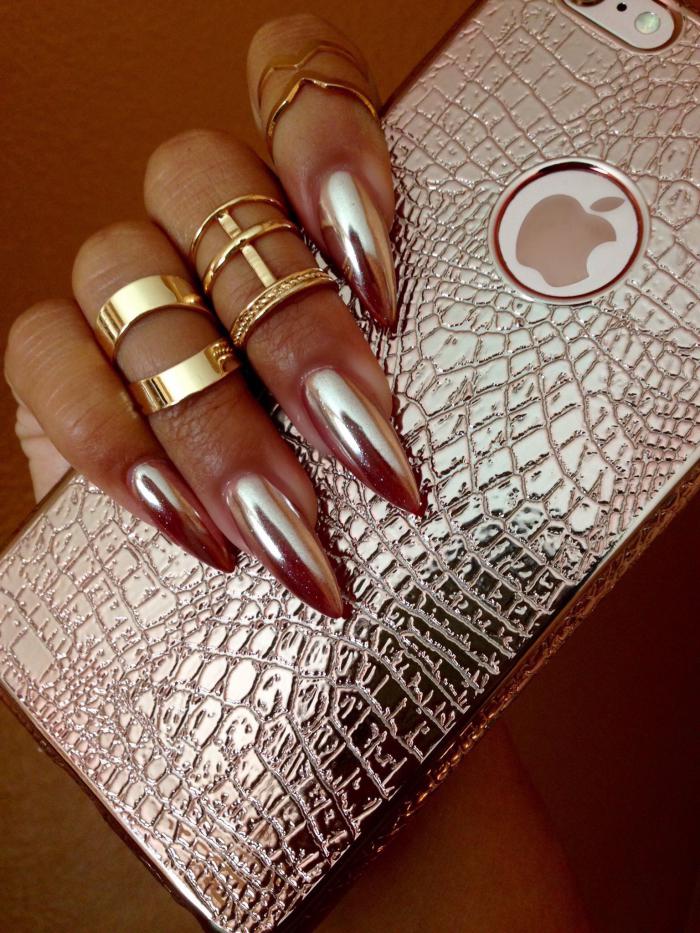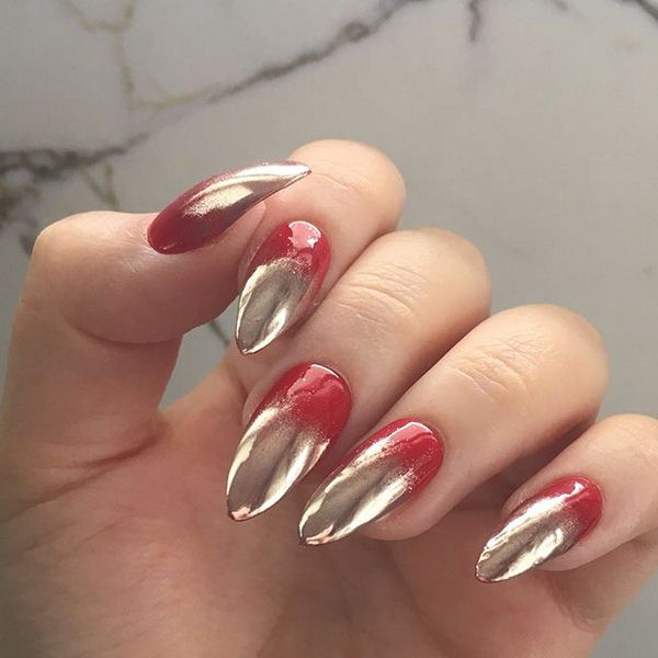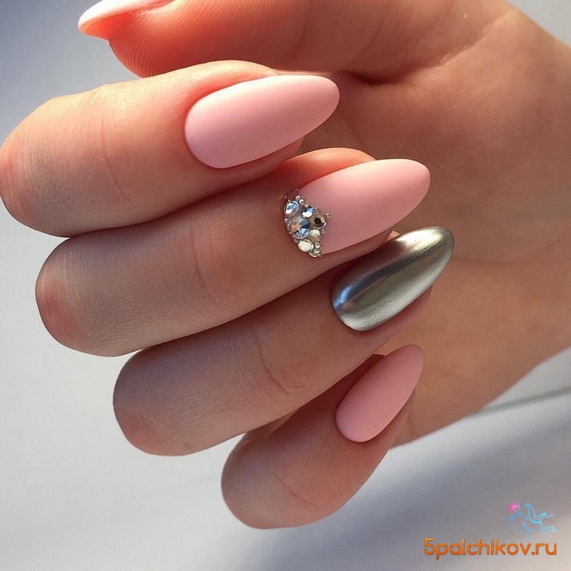 Nail plates of the given form with use of rub in of different shades will look beautiful. You can make it on one finger or decorate everything at once. Bold ladies can use the mirror options, they emphasize the originality and beauty of nails.