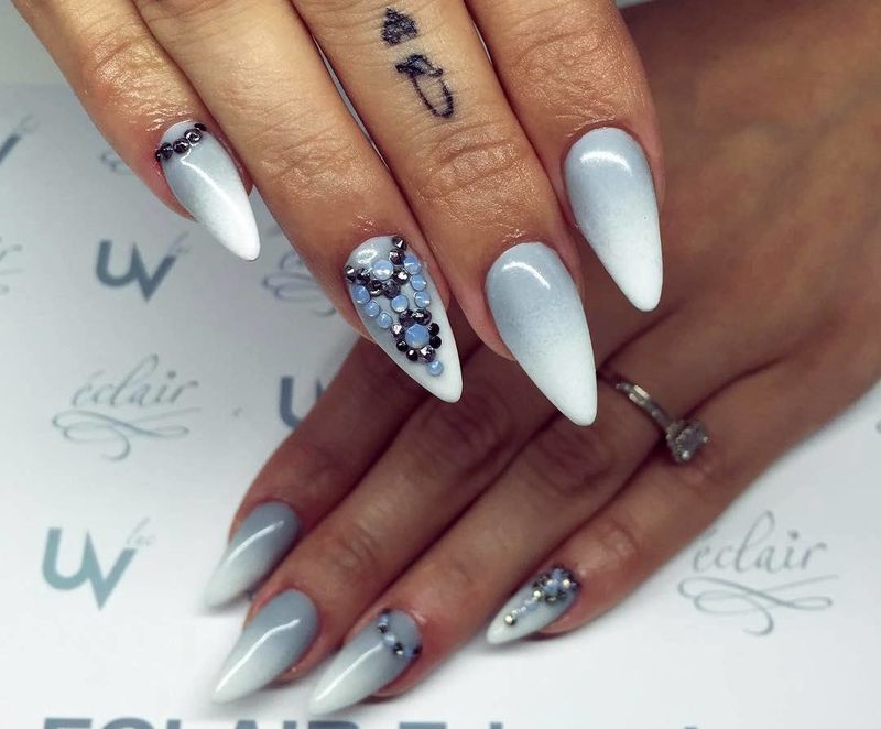 Smooth transitions always look elegant and nontrivial. Snow-white coating can smoothly flow into pink, mint, blue, cream. On sharp nails, this style looks sustained. Such nails will look delicate, and fit to any image.