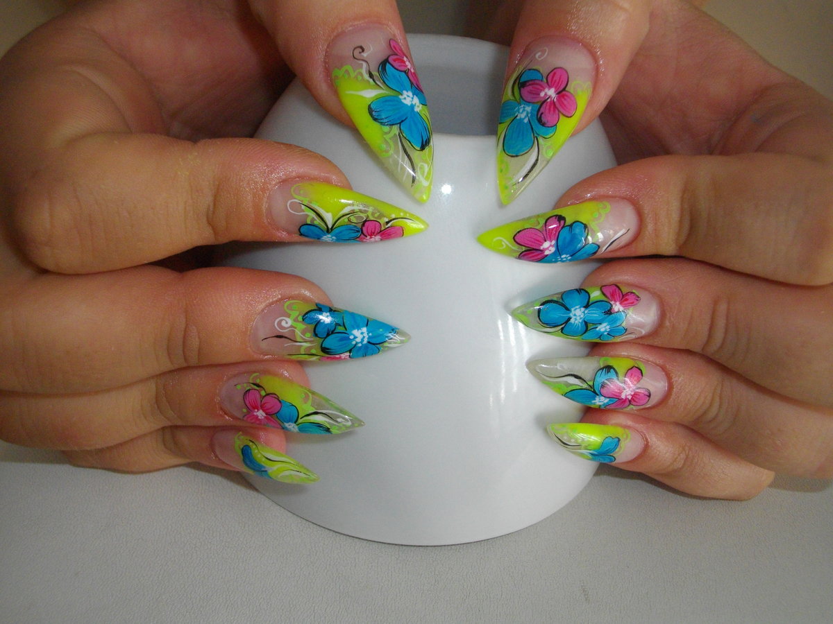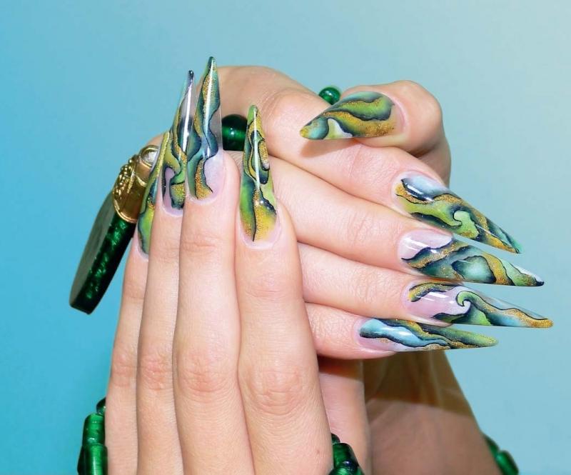 That sharp long nails allow you to embody an interesting three-dimensional effect. You can lay out with the help of different layers of the world of flora and fauna, depict frozen stones. It is only important to find a real professional who can embody such nails.