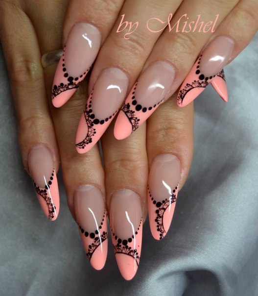 If you are just a beginner master, but want to embody a stylish manicure on sharp nails, you should start with the simplest patterns, gradually moving to complex elements. For example, initially you can embody various monograms or create a French manicure, also combining the technique with different patterns.