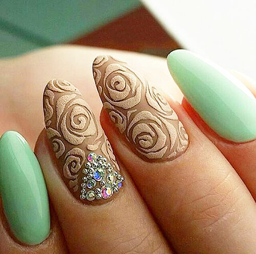 In addition, you can arrange different elements of decor on the same nail, selecting the desired color in tune to the dress. Such hands will look creative and interesting.