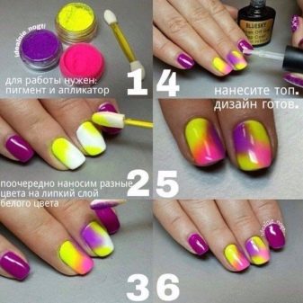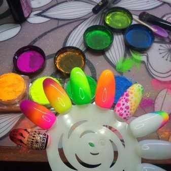 Distinguish these dyes and tint effect. It can be: matte, mother-of-pearl, shimmering, radiant, brilliant with modulations. It is necessary to choose a pigment depending on the type of design. For example, pearl dyes will create the smoothest and most effective transitions when using the ombre technique.