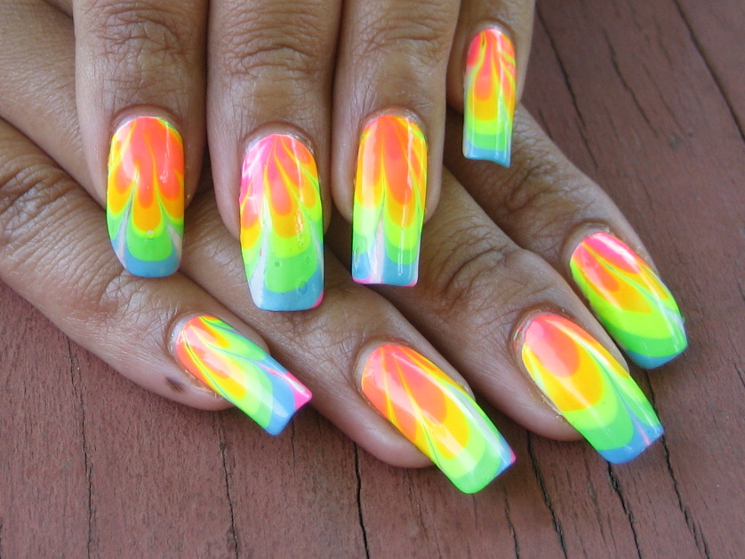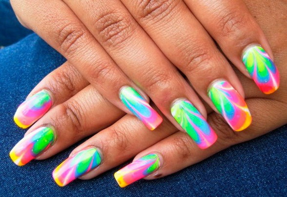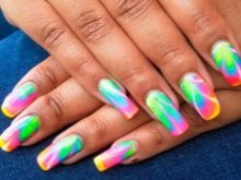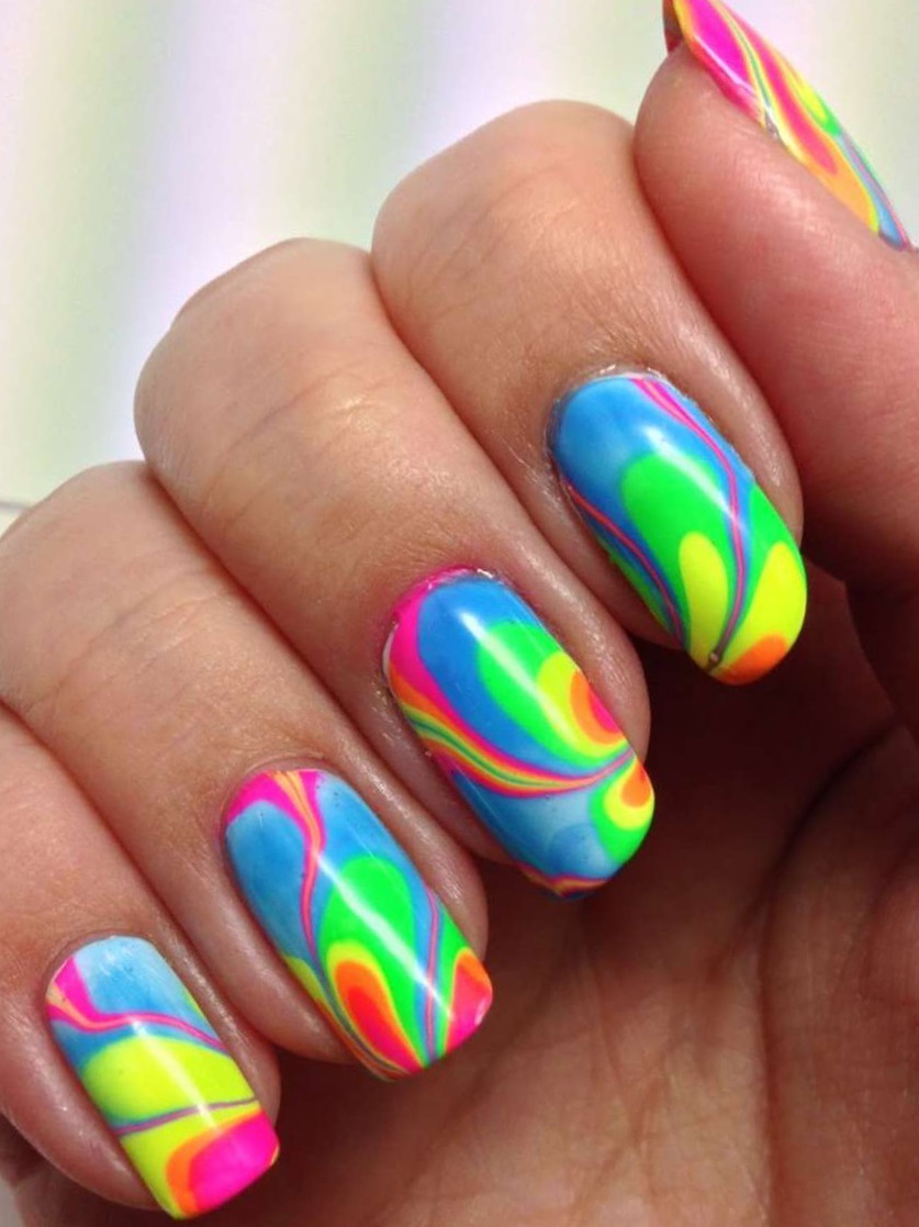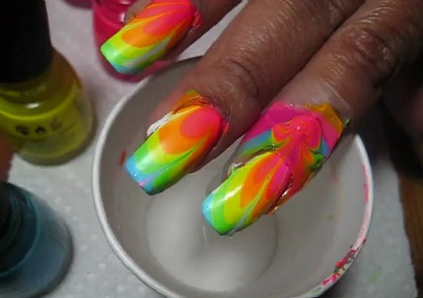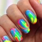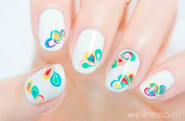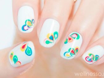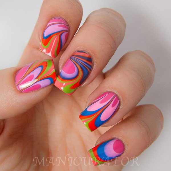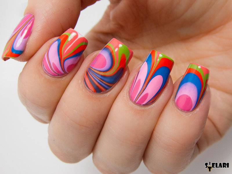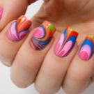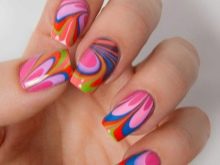 This is another non-standard and interesting look. To create a manicure with this design, you need to drop a few drops of varnish of different colors into the water and stir them with a toothpick. After that, the nail fully treated and covered with the base is immersed in water and then dried. In the end, the top is applied, and the nail is dried again.