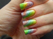 Rainbow manicure itself is in most cases bright and catchy, however, some may not have enough of it, so in addition to the manicure you can use sparkles and rhinestones, they will give a special aura and instantly select the owner of such nails from the crowd.
