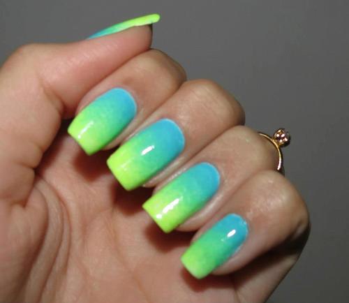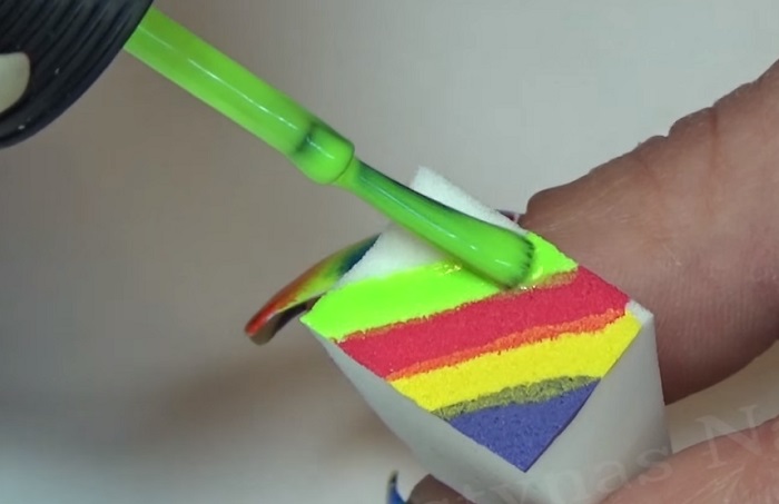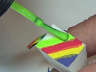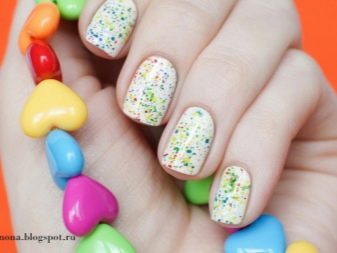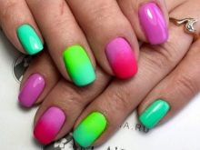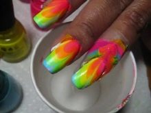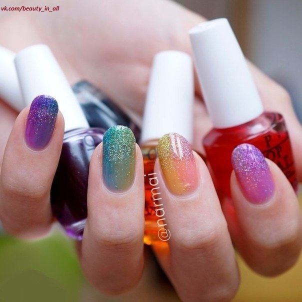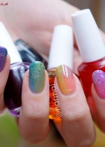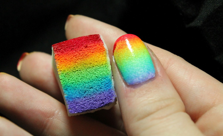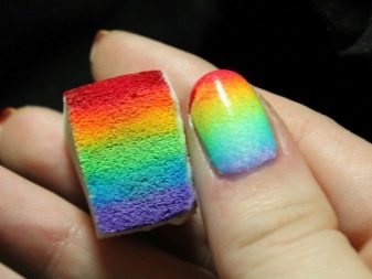 - Next you need to take an ordinary sponge and cut it into small pieces, a little more than the nail itself.We apply varnish of different colors on each piece, two colors are allowed for one segment. Colors are applied in any combination, it all depends on your desire. If there is no time to think, you can simply decorate your nails with all the colors of the rainbow.