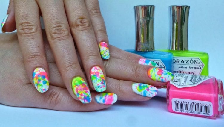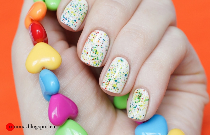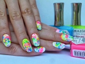 The essence of this design is to create a kind of color blots on a white background. The process is practically no different from the previous options, except for applying color. Splashes of color are created on a white background with the help of a tube into which you need to drip a little bit of colored varnish. After each tone, the tube can be cleaned for the purity of the colors or, conversely, create mixed sprays. In addition to white lacquer, there are usually used 3-4 different colors, including black and can be connected, but only in combination with other bright colors.