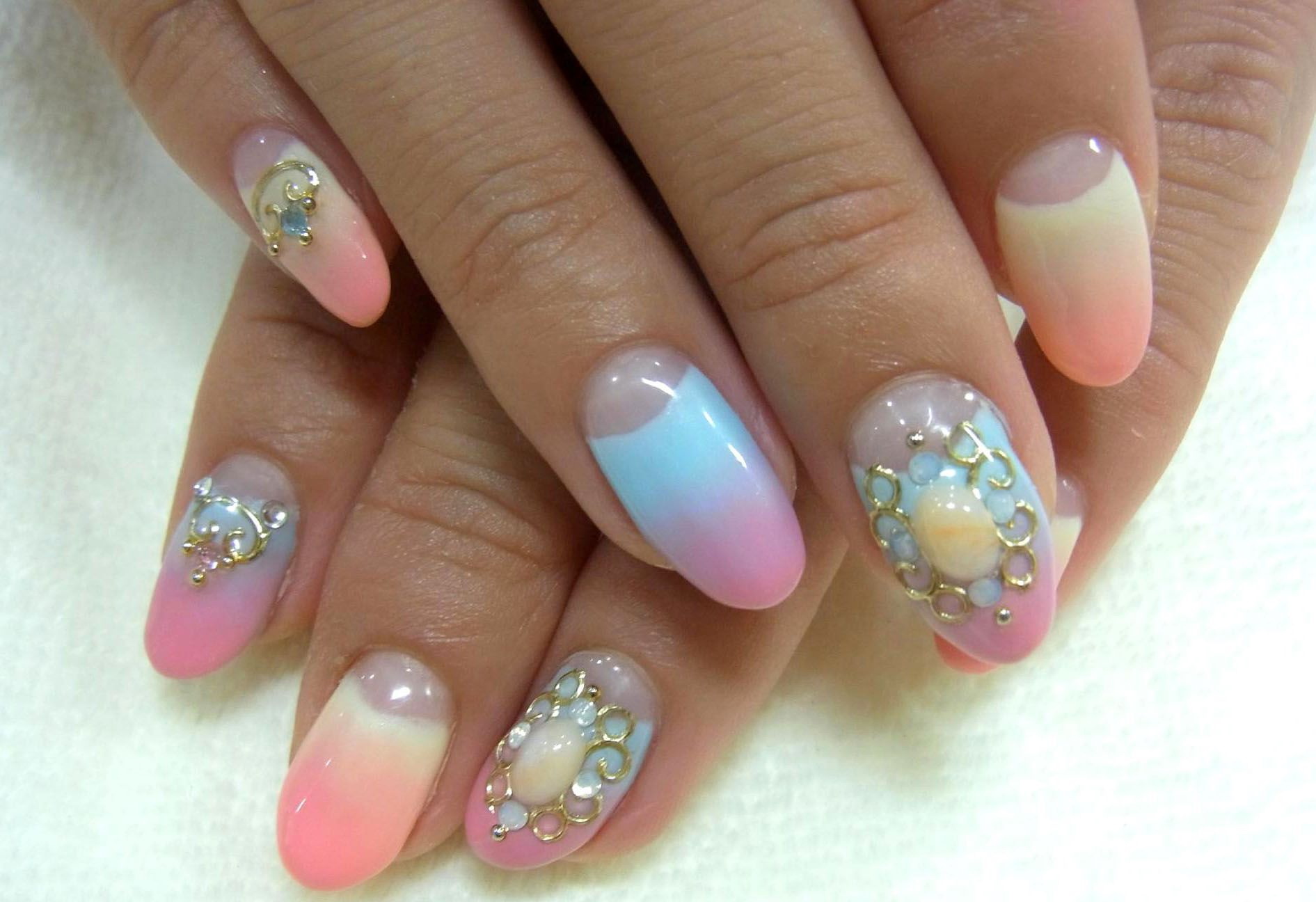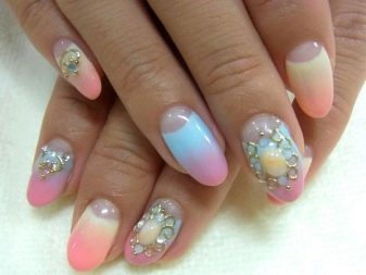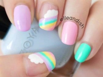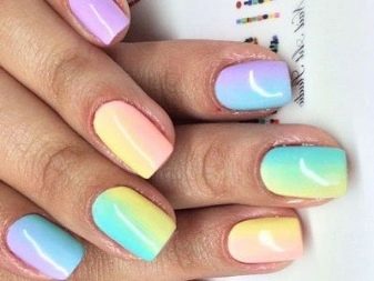 Subspecies of rainbow manicure, which has a wide variety of variations. Its difference is only in the use of nude and delicate shades. The purpose of this design is a colorful manicure, but without too much catchiness. It will suit fashionistas who do not like to stand out.