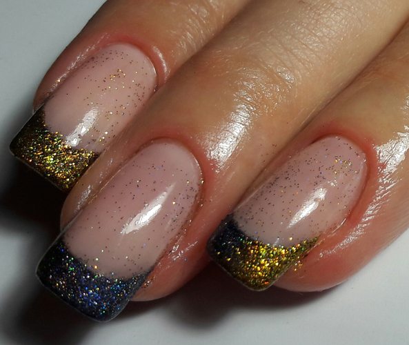 - French manicure. To create a stylish modern jacket, glitter must be applied along the line of the tip of the nail using a template. In some cases, you can use a special dense adhesive tape, which will ensure even application. This is a very elegant manicure. Depending on the desired effect, you can apply glitter on the paint of a neutral or bright color. Especially beautiful looks French manicure with a scarlet base varnish and gold glitter.