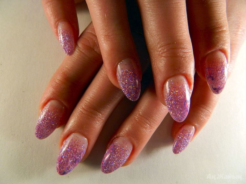 - The most feminine option - manicure with pink sparkles, made on a transparent background. Very elegant, it will look on the oval shape of long nails. This option is easy to emphasize both office and solemn image.