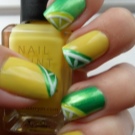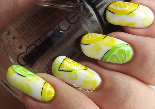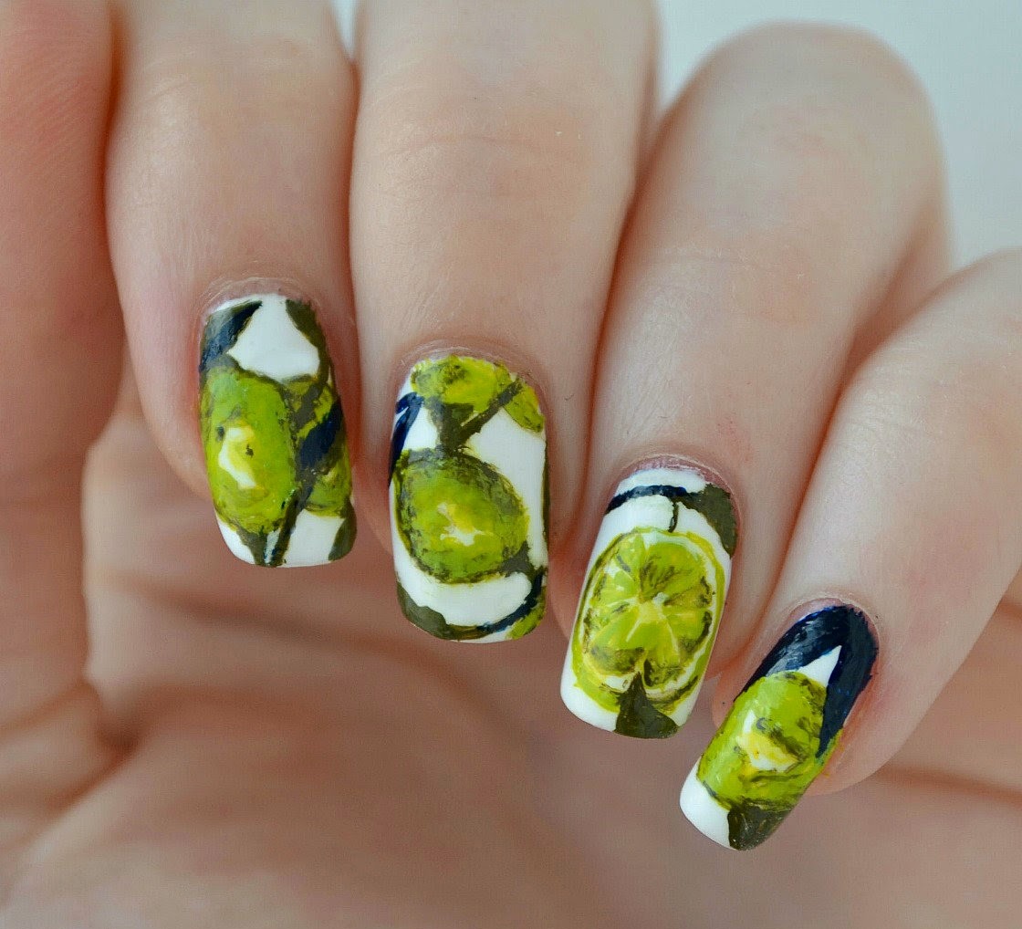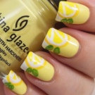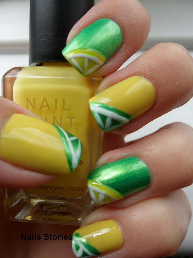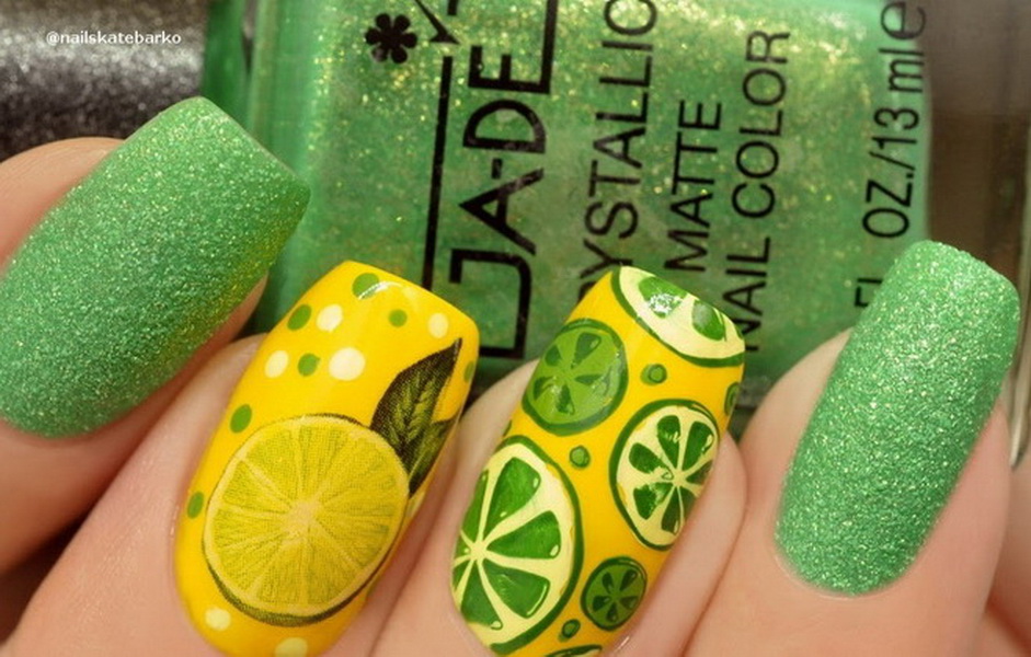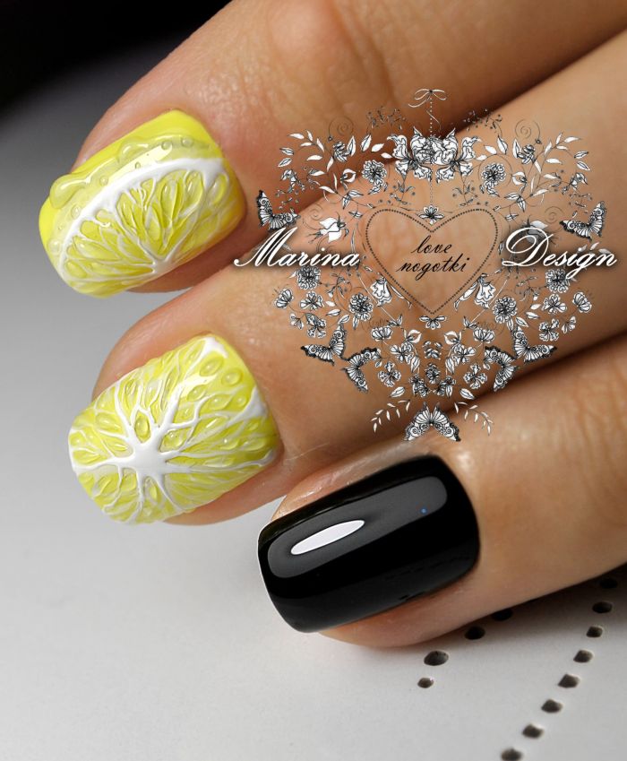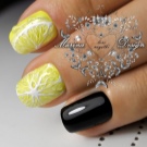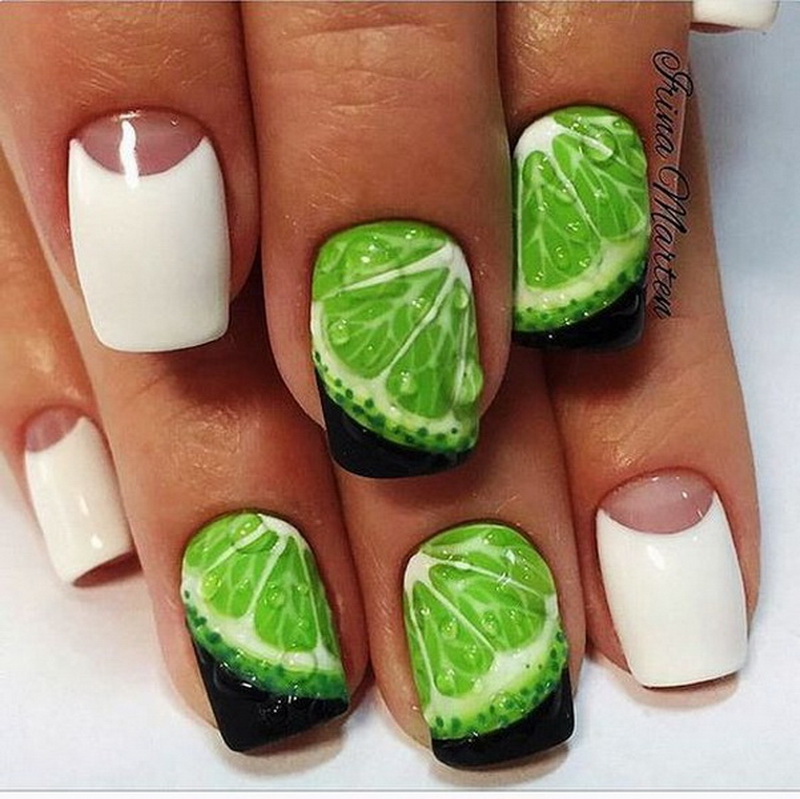 - Black and lime colors in alternation on some nails, scattered small citrus fruits on ring fingers.