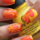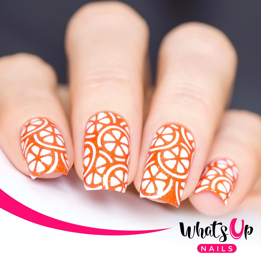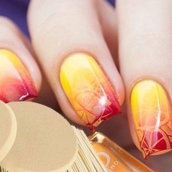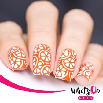 - Reversible stamping involves the transfer to the nail plate of the finished slider. The sticker on the nails in the form of an orange looks very neat. This technique is successfully used at home. The surface of the nail varnish of the selected color. An ornament is applied to the coated surface with a silicone stamp, which can be purchased at a specialty store.