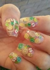 An interesting idea of manicure from the colorful slices of citrus. You can imagine that this is a unique kind of jacket. Suitable for active and motivated girls.The original layout of juicy fruits: the smile line on long nails is filled with delicious orange oranges.