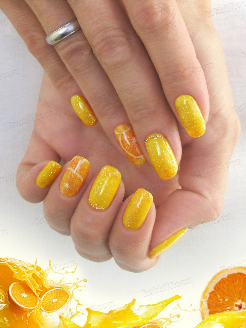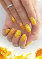 - Photo Design allows you to use for decorating nails original photo of orange mandarins or lemons in the cut. In the professional store, photo stickers with citrus are purchased, easily and simply attached to the nails and covered with a fixer.