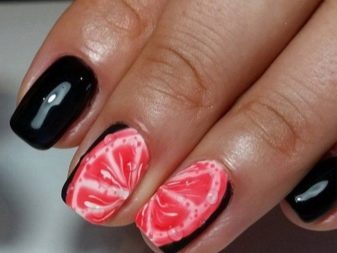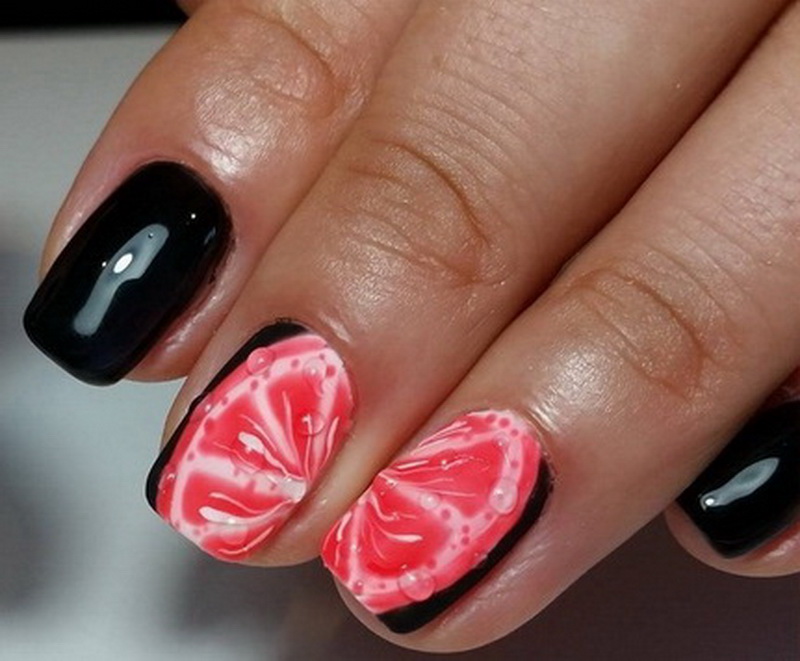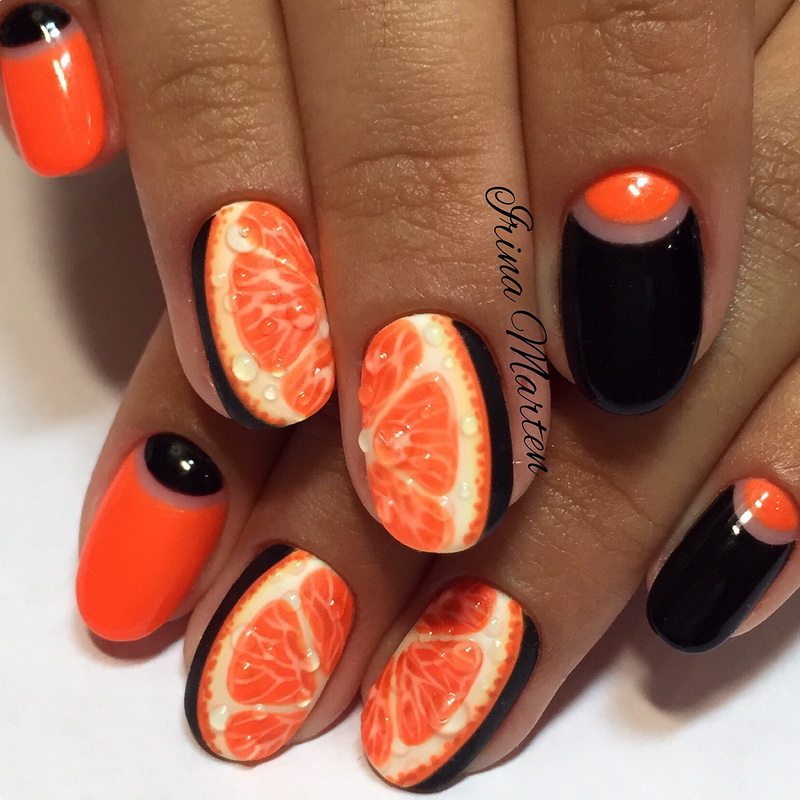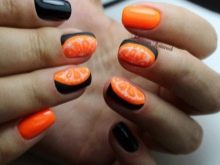 Another orange sun on the nails is a rich grapefruit with a realistic image of the fruit's flesh. The elegant contrast of black with red is always fascinating. This combination is chosen passionate seductress and playful flirty. A manicure design with such a combination of colors and the inclusion of juicy citrus fruits will add zest to its owner.