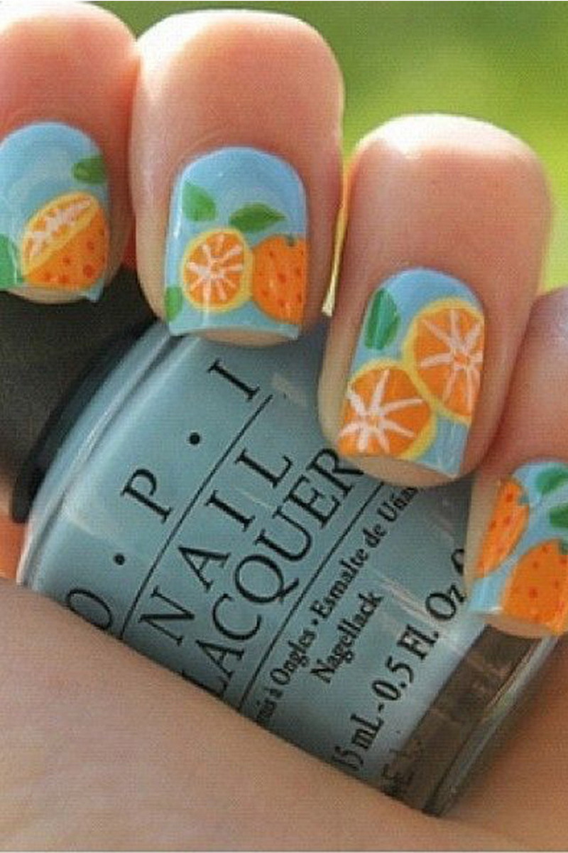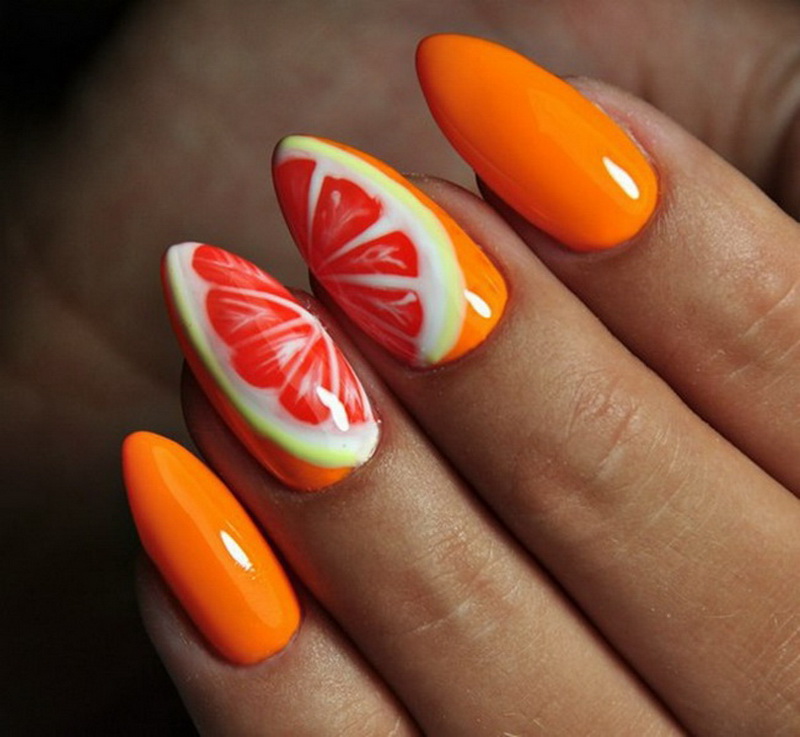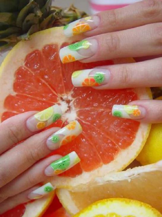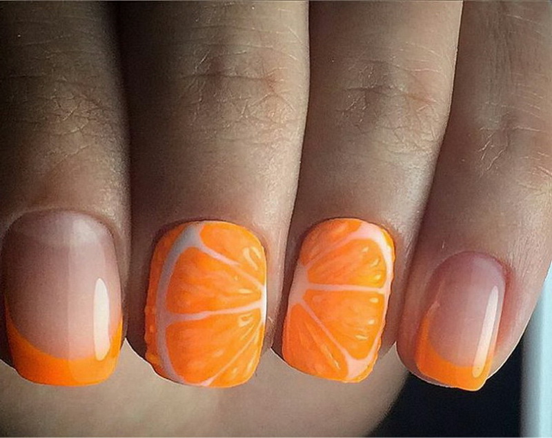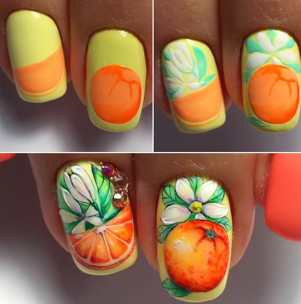 Each nail master has his own techniques and secrets of nail design in the style of tropical citrus. Nail design methods are based on the principles of clarity and professionalism of the master. To create a design with citrus, the following simple techniques of applying an ornament to the nails are applicable.