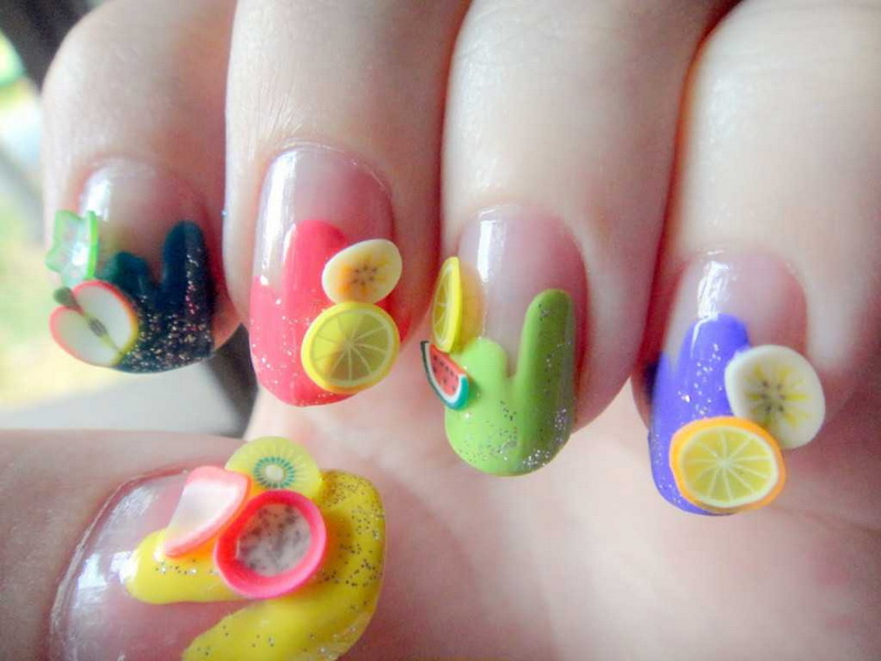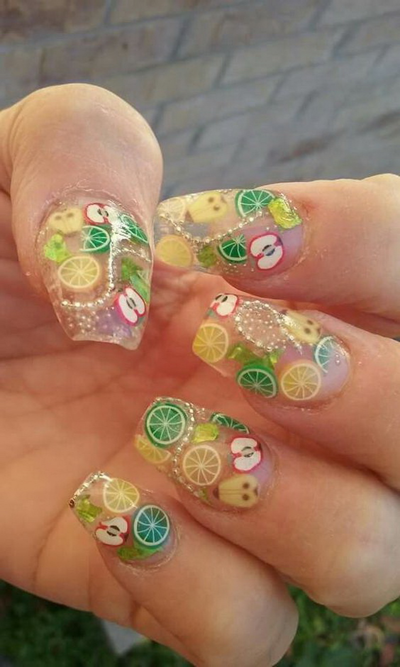 - Manicure pastel tones with drawings of fruit assortment: banana and grapefruit; kiwi and lime