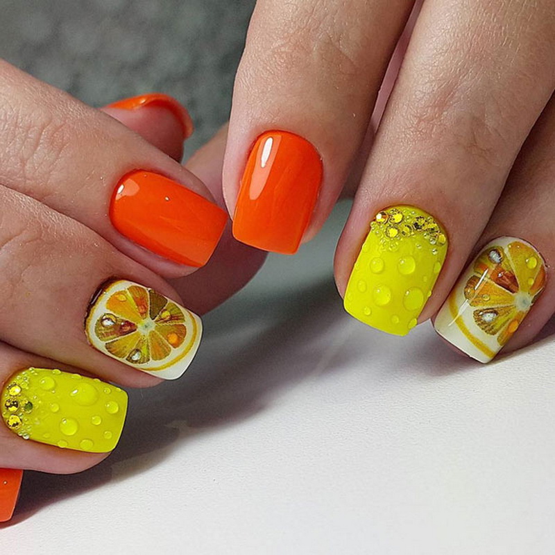 For citrus nail design, you can use different combinations of colors and a mixture of decorative elements. However, it is necessary to take into account the balance when making nails: busting the decor in an already striking and spectacular design will look at least not aesthetically pleasing. To create a stylish manicure, you can apply the following beautiful combinations.