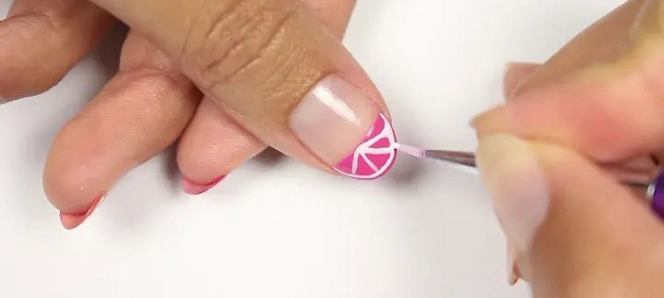 - It is necessary to draw the fruits slowly, highlighting the boundaries, as realistic as possible.With a white gel polish, you must first draw a semicircle, which we will later use as a basis for a slice of citrus.