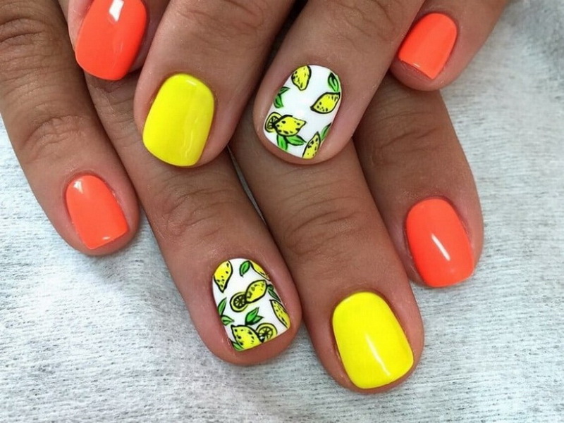 The combination of three colors: the alternation of lemon and orange hues, and on a white background, which underlined the ring fingers, are shown lemon leaves in bulk. This design looks great on short nails.