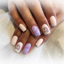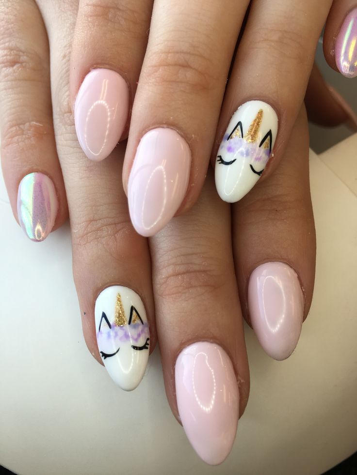 There are several options for rubbing, and one of them was even named after the unicorn. It is distinguished by a delicate color with glitter that looks like a pearl. Its color transitions are from white to pale pink, but there are also variants of rubbing with brighter colors. However, the classic pink and white version is exactly what is needed in this case. It remains to add a small monochromatic image of a unicorn, maybe a couple of decorative elements, and you get a discreet manicure, which even at work would be quite appropriate.