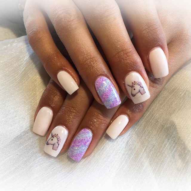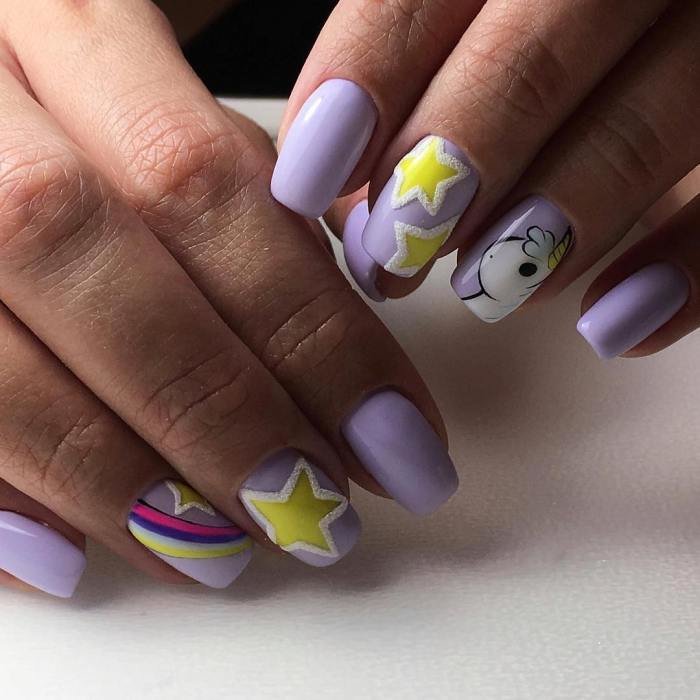 You can also take bright colors and create a blue sky with a rainbow and a unicorn, which will give your nail design an image of childlike immediacy.