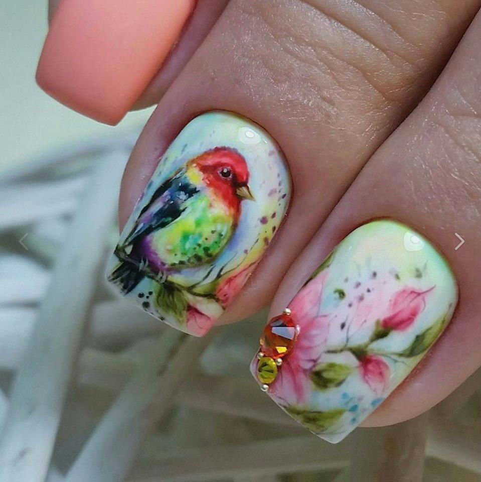 There is no need to strictly place the pattern on all the nails the same. If you have chosen as the image of birds, a chaotic arrangement will look much more interesting. In addition, it is enough to issue only one or two accent nail.