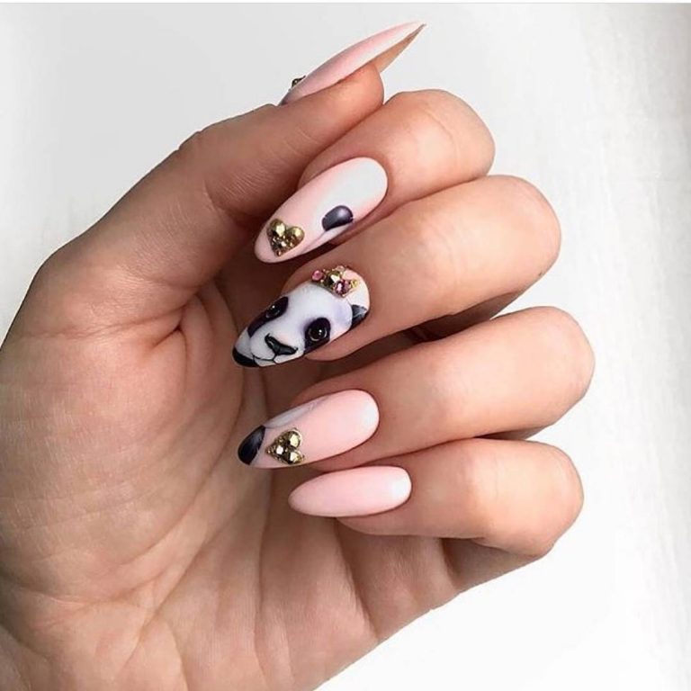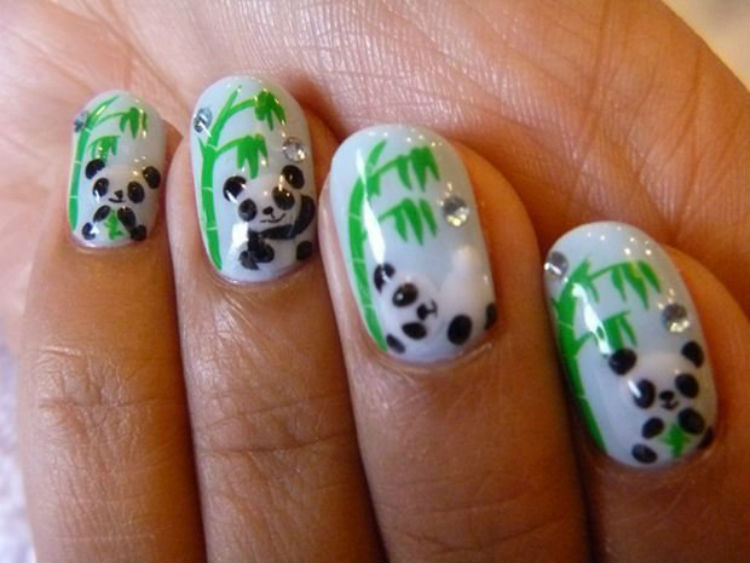 Pandas are one of the most popular nail art drawings. They look great on a neutral surface in combination with juicy green elements.