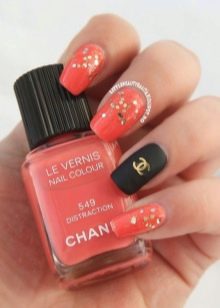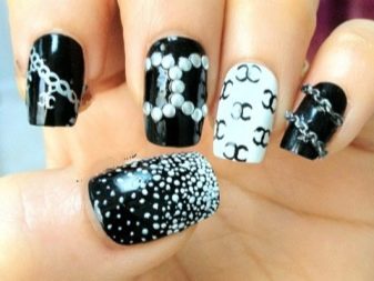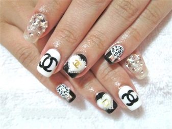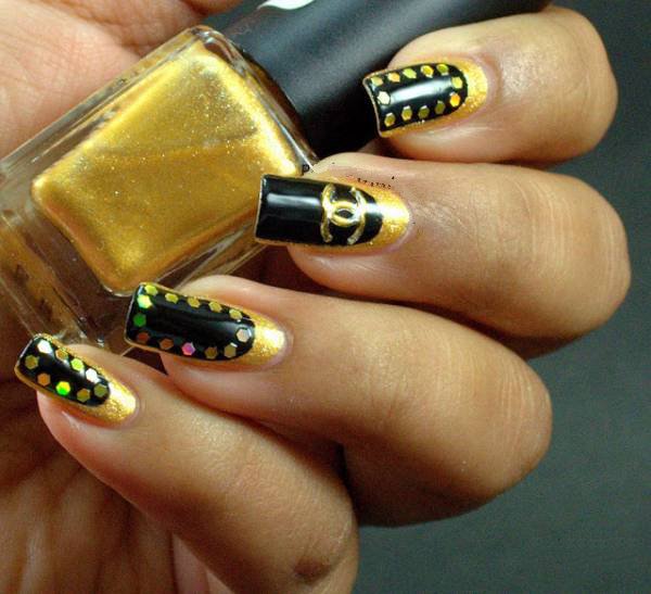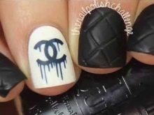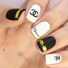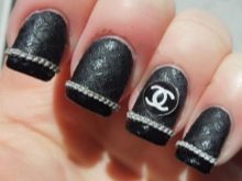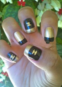 To make the black and white combination look more elegant, a shine is used when performing a manicure in the Chanel style. A plate is covered with golden glitter or a logo is depicted.